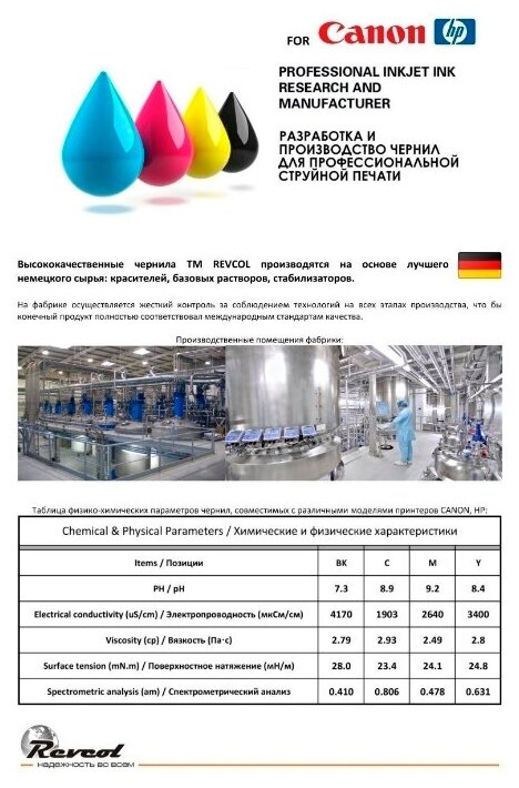 Чернила Revcol, для Canon: Canon PIXMA G4400/ G4410/ G1400/ G1410/1411/ G2400/G3400/G3410/3411/3415 / G2410/2411 и т. д, комплект 4 цвета,
