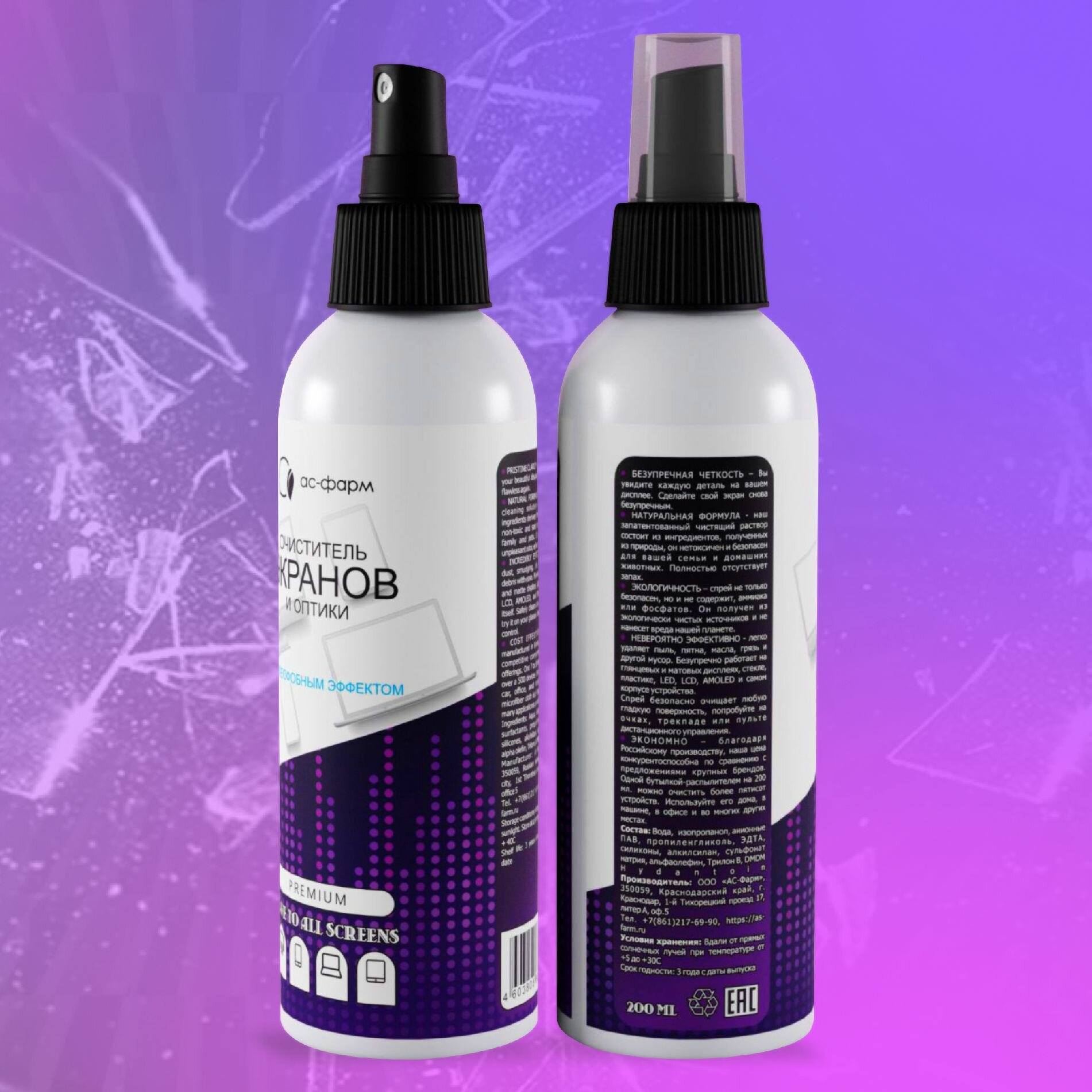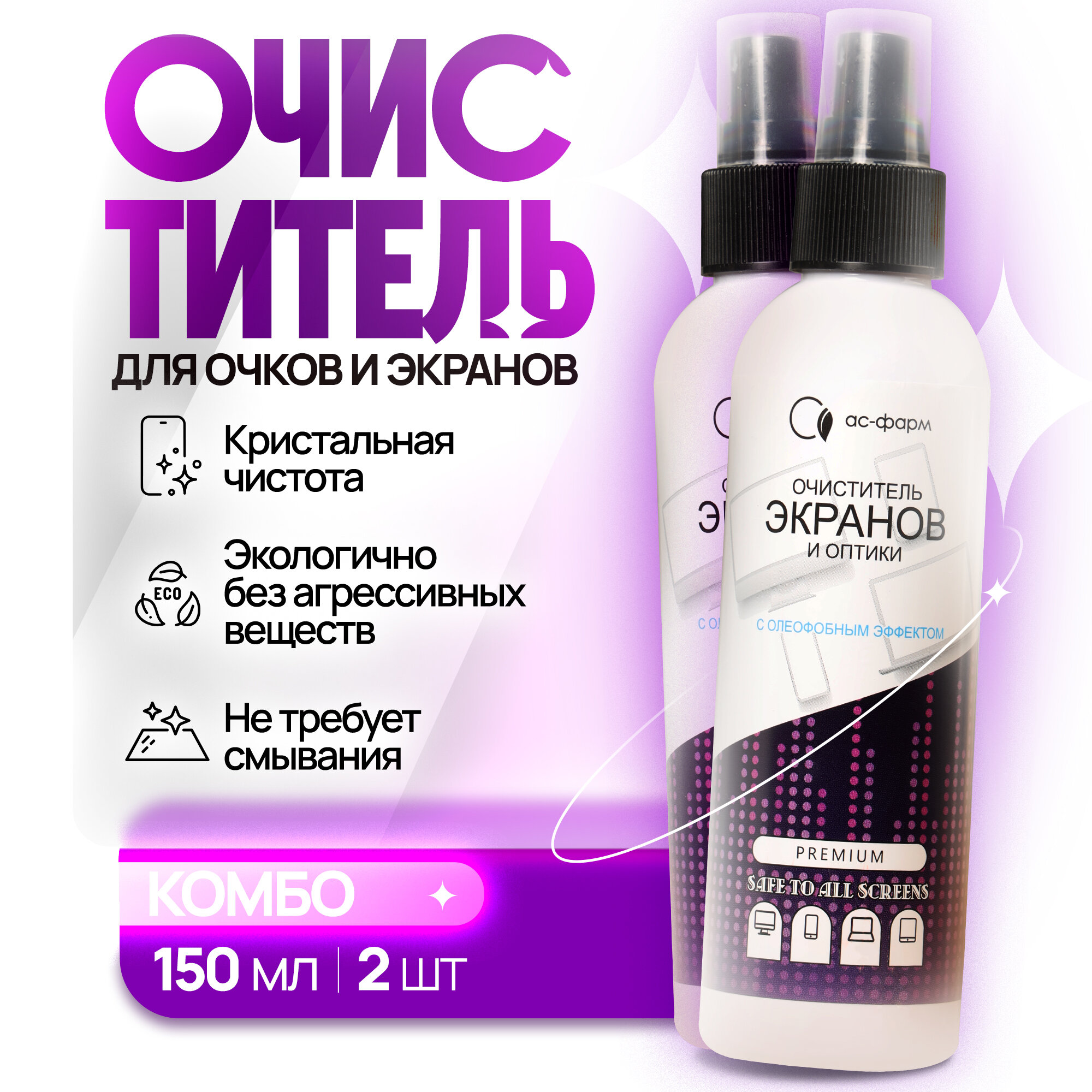 Спрей очиститель для мониторов, экранов, оргтехники и оптики, «АС-Фарм», 200 мл, 2 шт, с олеофобным покрытием информация: