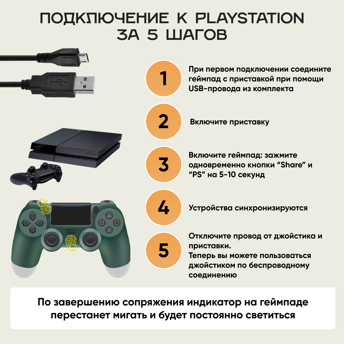 Геймпад для PS4 Зеленый / Джойстик контроллер для Playstation 4, PC, Android, iOS + провод 1 метр информация: