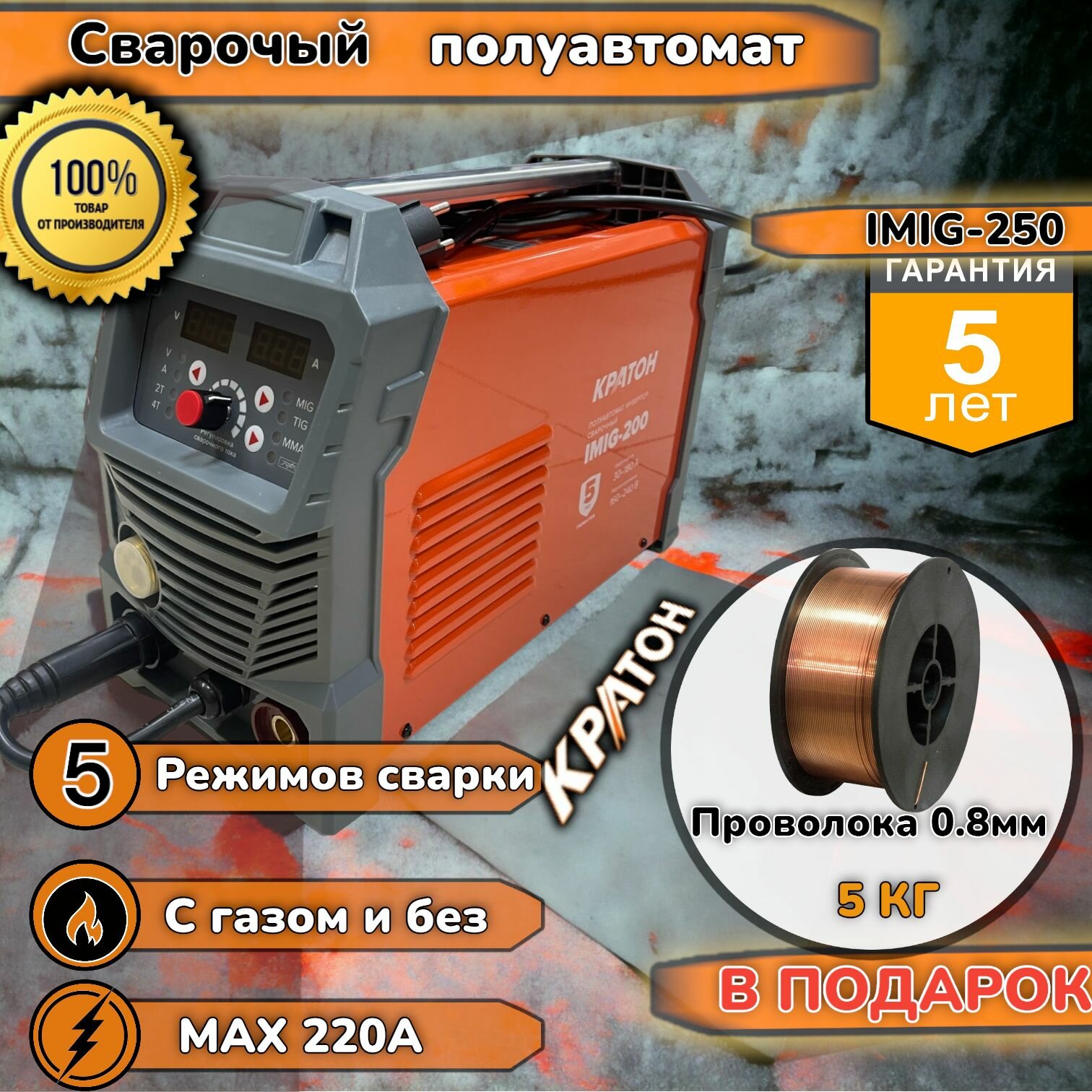 Отзывы на Cварочный инверторный полуавтомат+ проволока 5 кг в подарок Кратон Оригинал IMIGx 250, 7,5 кВт, 30-220 А, аппарат для сварки, сварочная машина