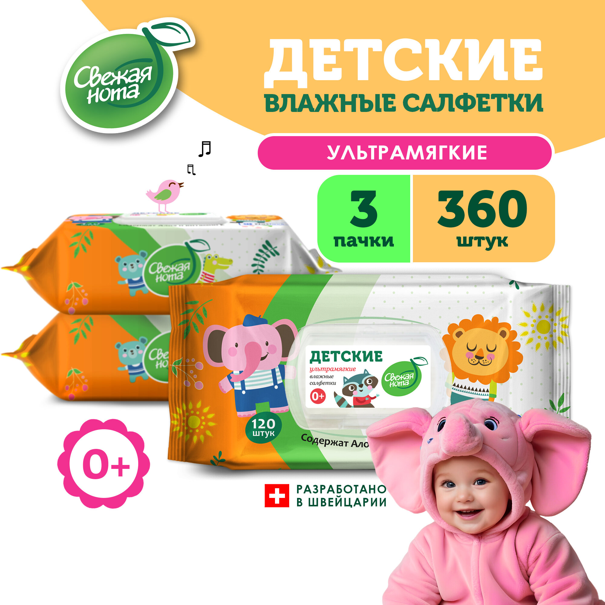 Свежая нота Влажные салфетки детские Ультрамягкие с экстрактом Алоэ Вера и Витамином E с клапаном, 360 шт. (120х3) информация: