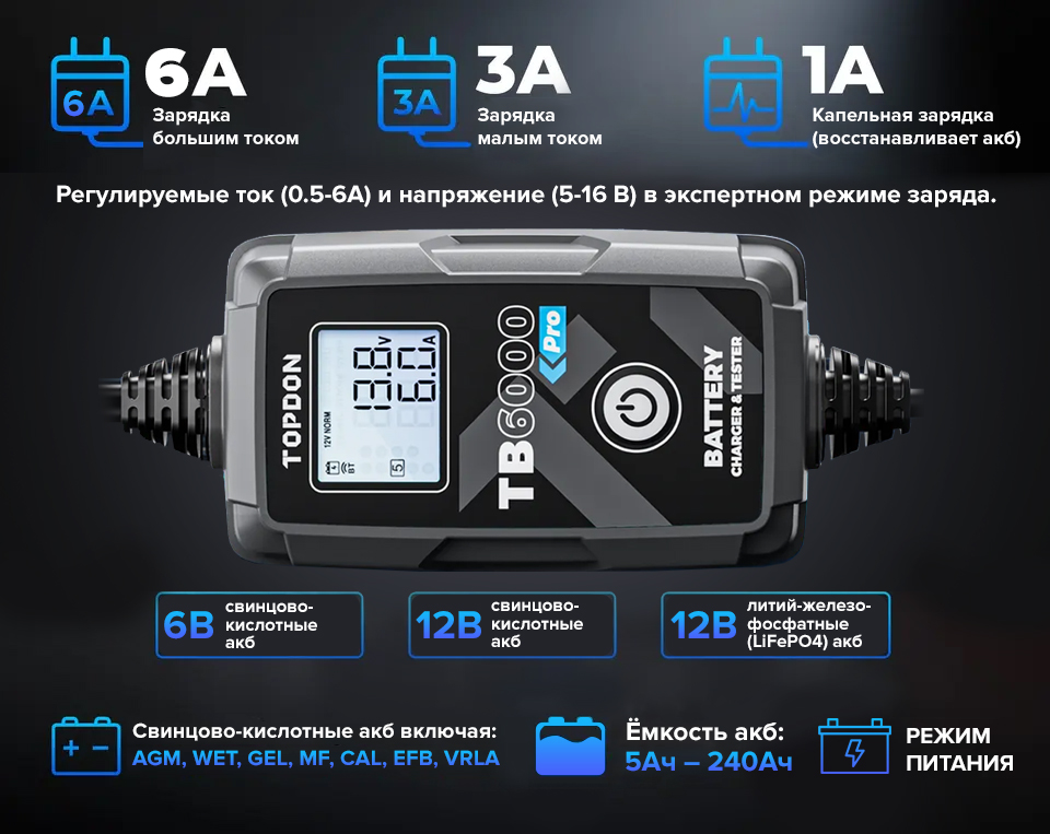 Умное зарядное устройство и тестер TOPDON TB6000Pro информация: