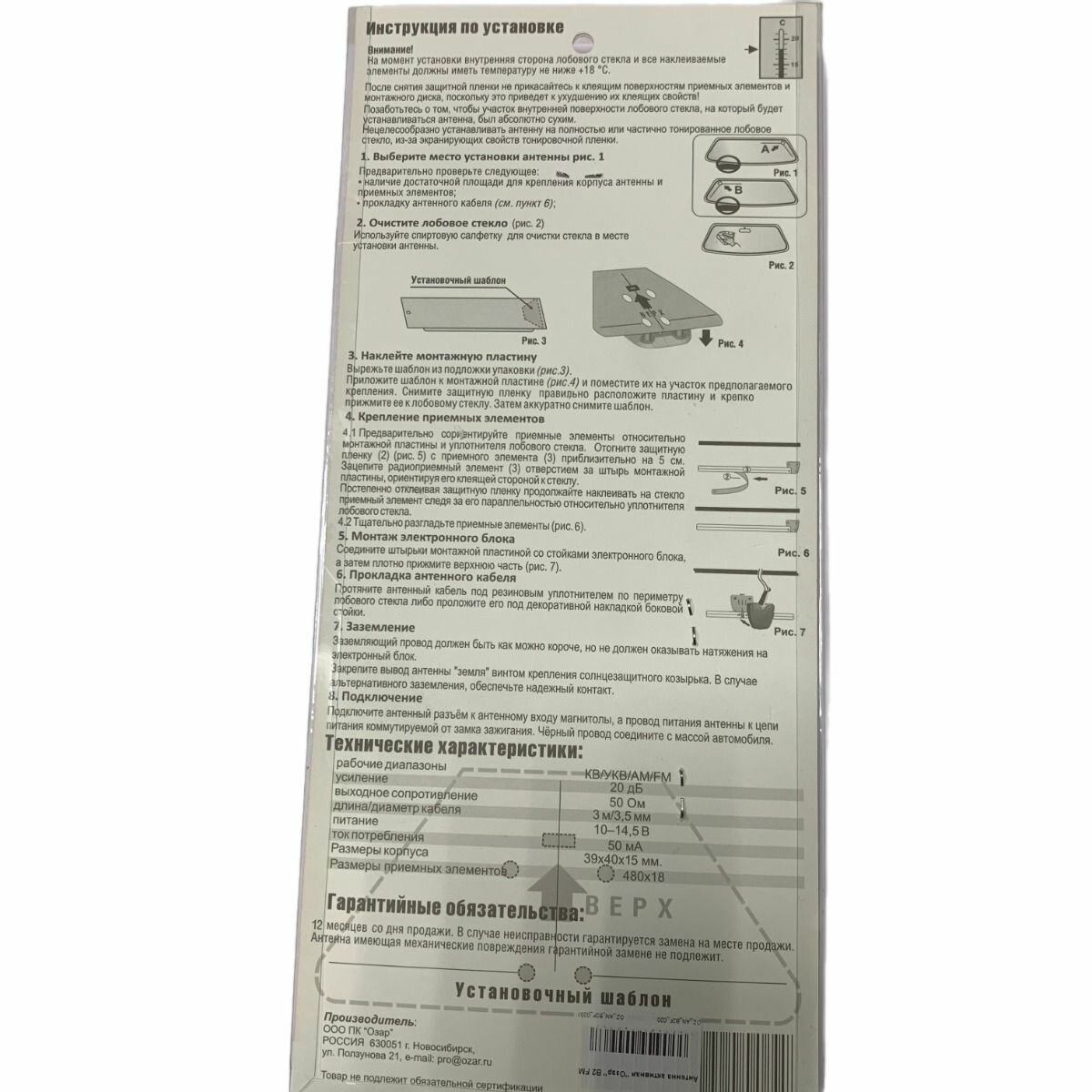 | Комплектация | Антенна активная для автомобиля Озар В2 FM 1шт |