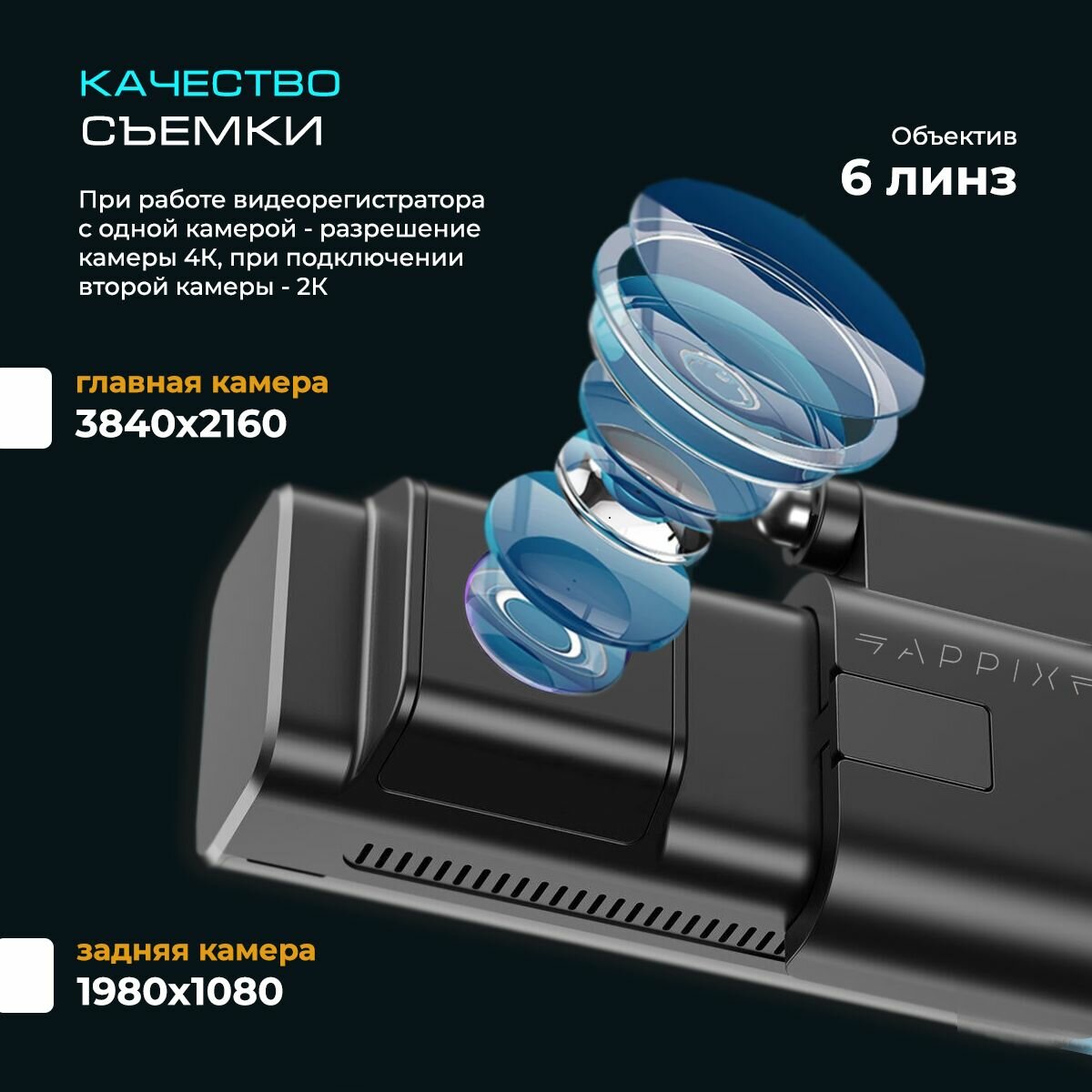 Видеорегистратор автомобильный Appix с разрешением 4к, с беспроводным подключением wifi, камерой заднего вида, sd-картой в комплекте информация: