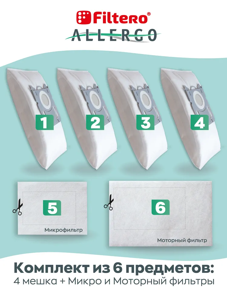 Мешки-пылесборники Filtero FLS 01 (S-bag) Allergo для пылесосов ELECTROLUX, PHILIPS, 4 штуки, моторный и микрофильтр, синтетические информация: