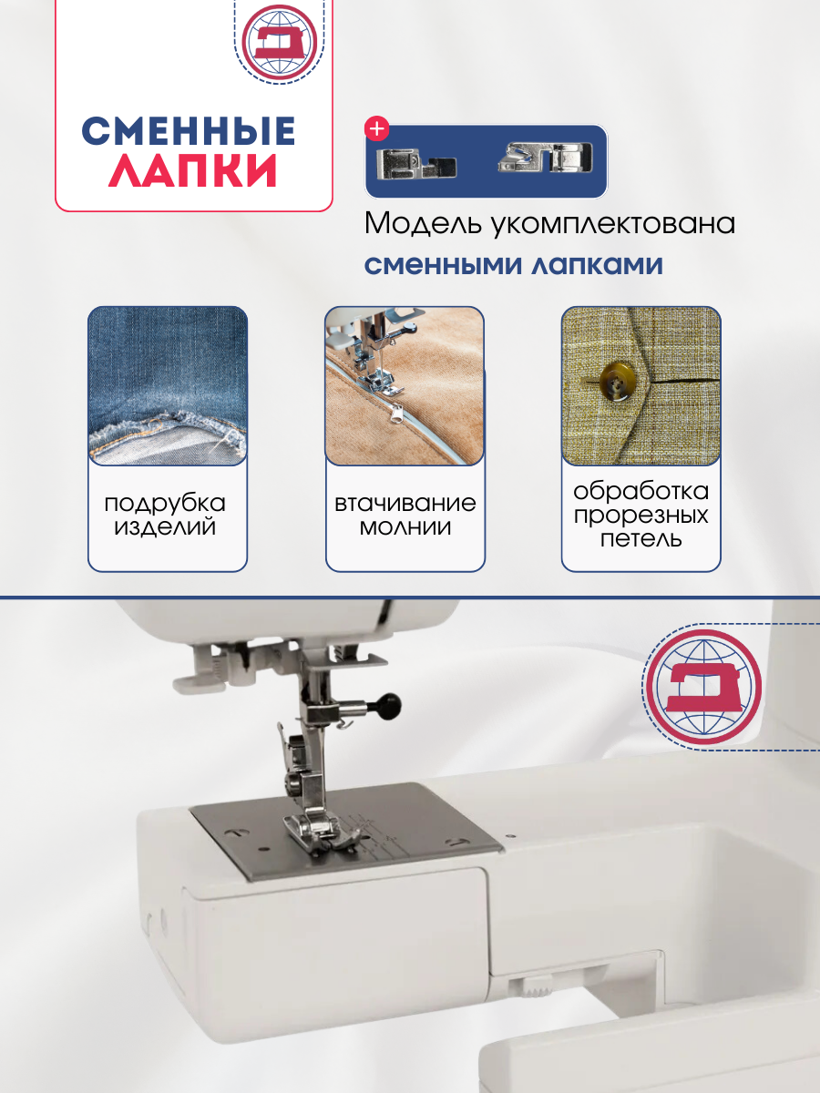 | Особенности | двойная игла, работа с грубыми тканями, работа с тонкими тканями, швейный советник |