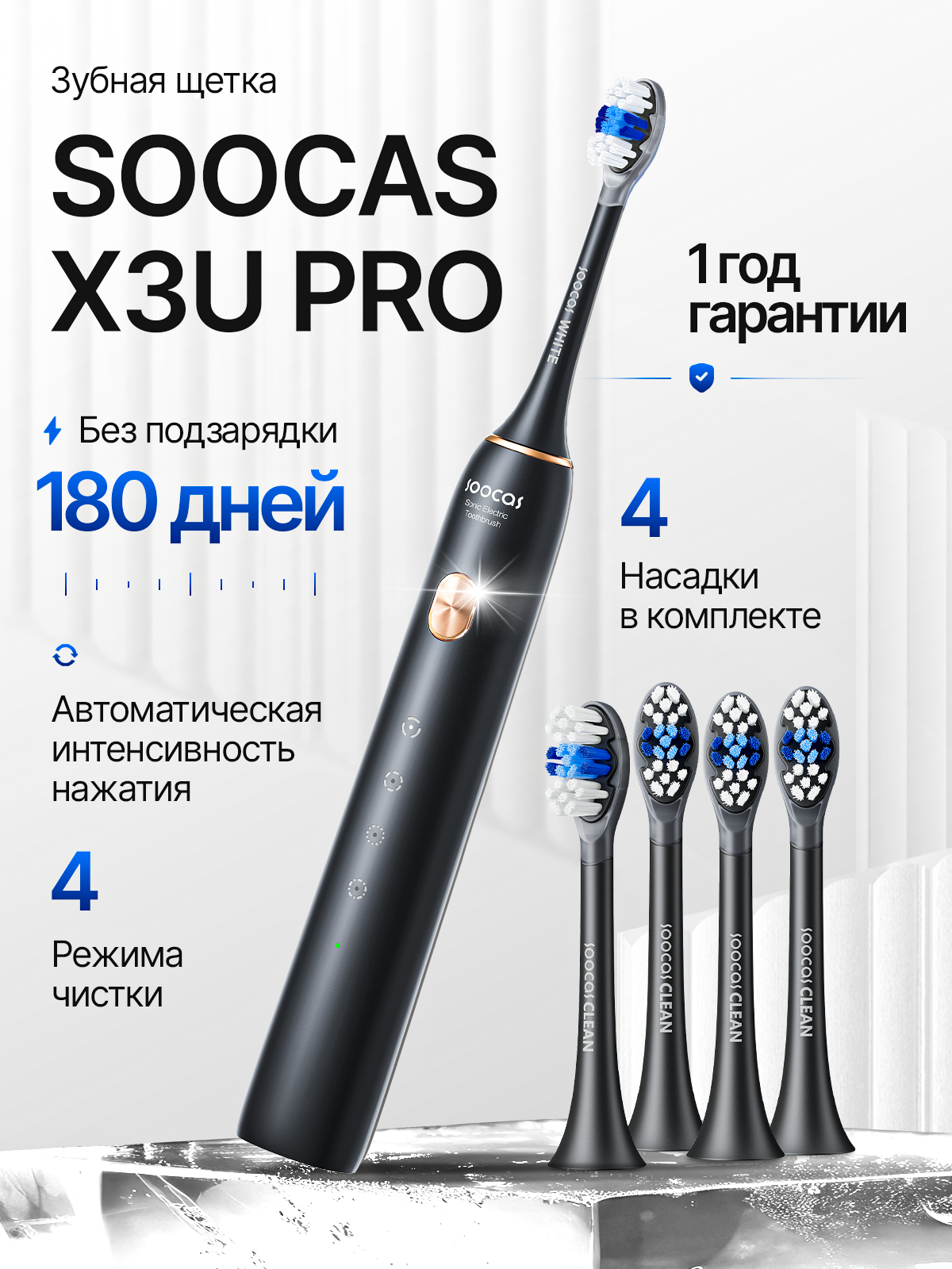 Электрическая зубная щетка Soocas X3U Pro (Ростест) четыре насадки, звуковая, черная информация: