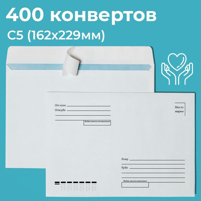 Почтовые конверты бумажные С5 (162х229мм) 400 шт. отрывная лента, запечатка кому-куда для документов C5 информация: