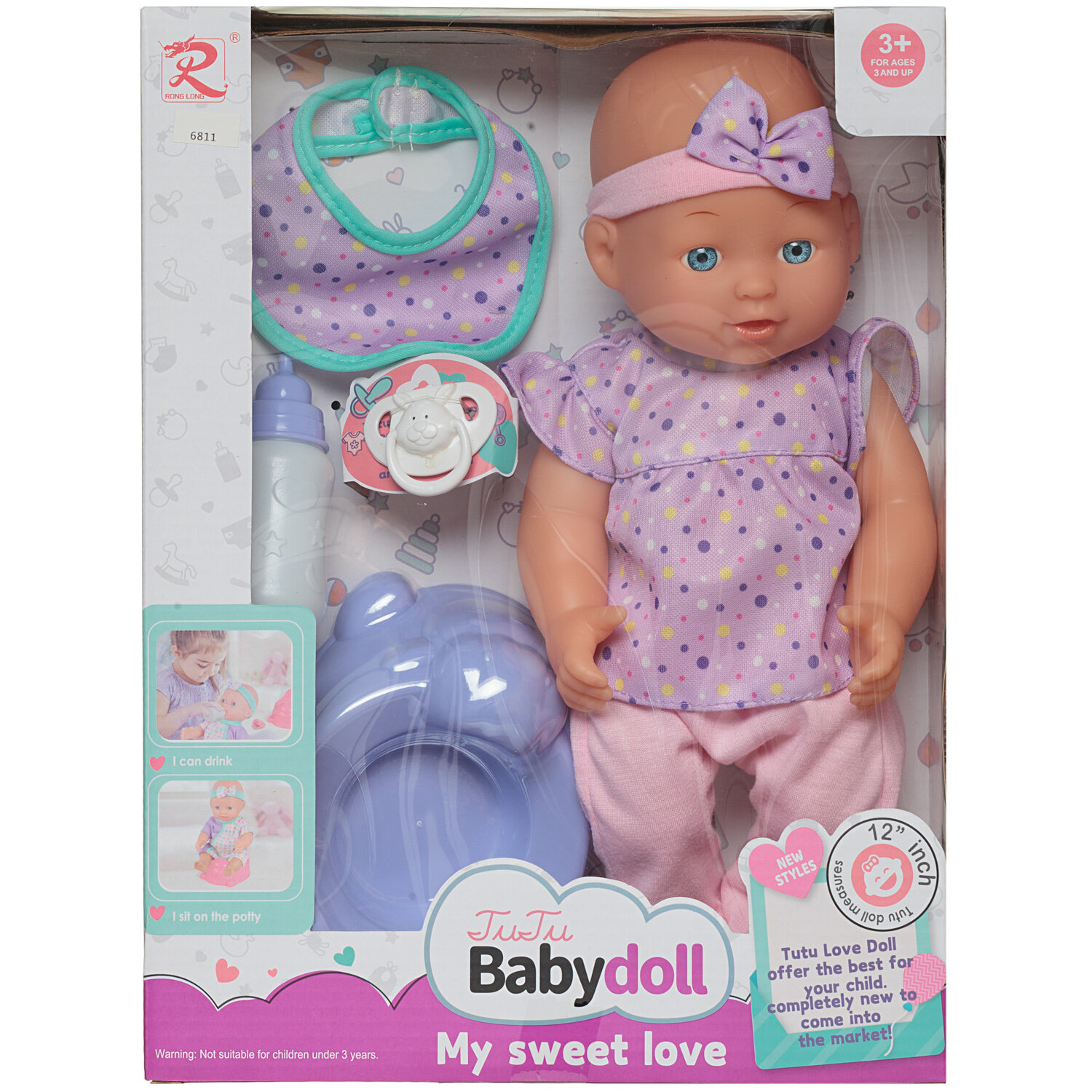 Отзывы на Игровой набор Junfa Пупс My Sweet Love 35 см в сиреневой кофточке и штанишках, с горшком, бутылочкой, соской и предметами для кормления WJ-36785