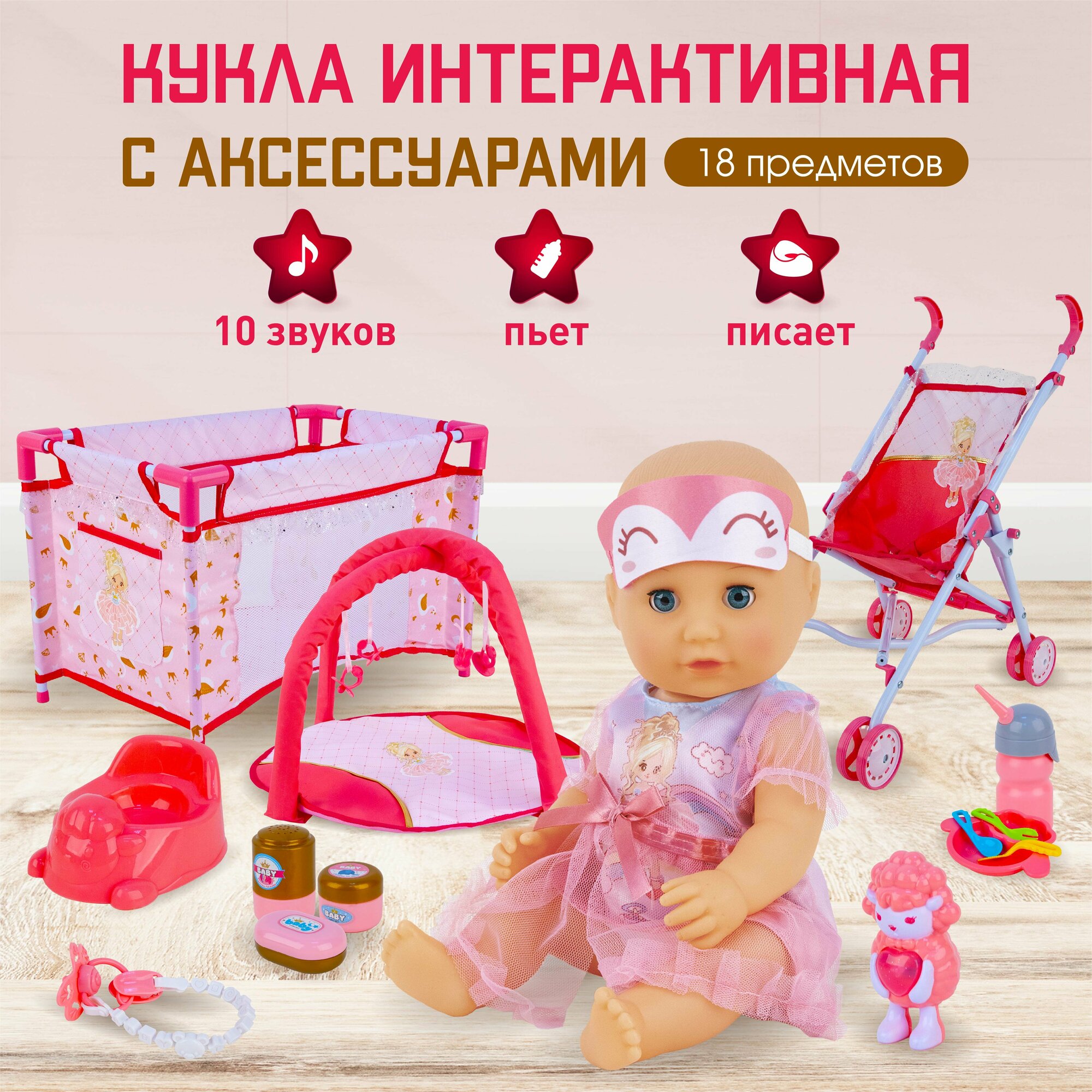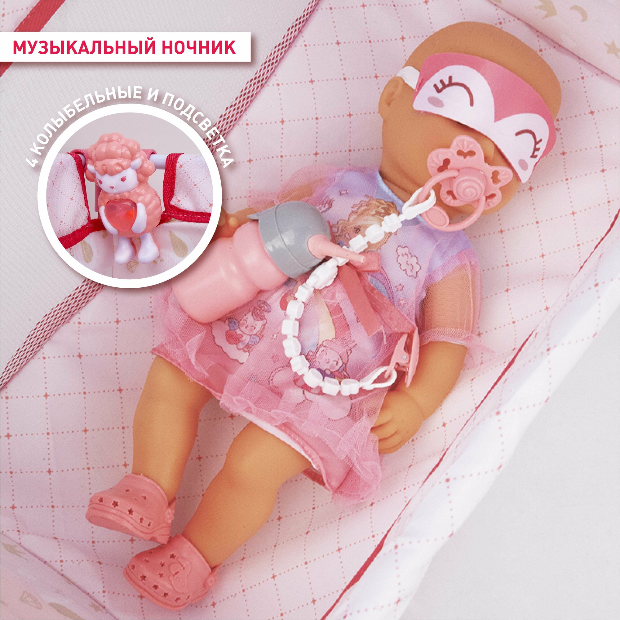 | Комплектация | кукла, кроватка-манеж, коляска-трость, детский коврик, музыкальный ночник со светом, соска, горшок, бутылочка, тарелочка, ложка и вилка для кормления, баночки «крем», «мыло», «присыпка», погремушка, пластиковый фартучек для кормления, две текстильные сумочки |