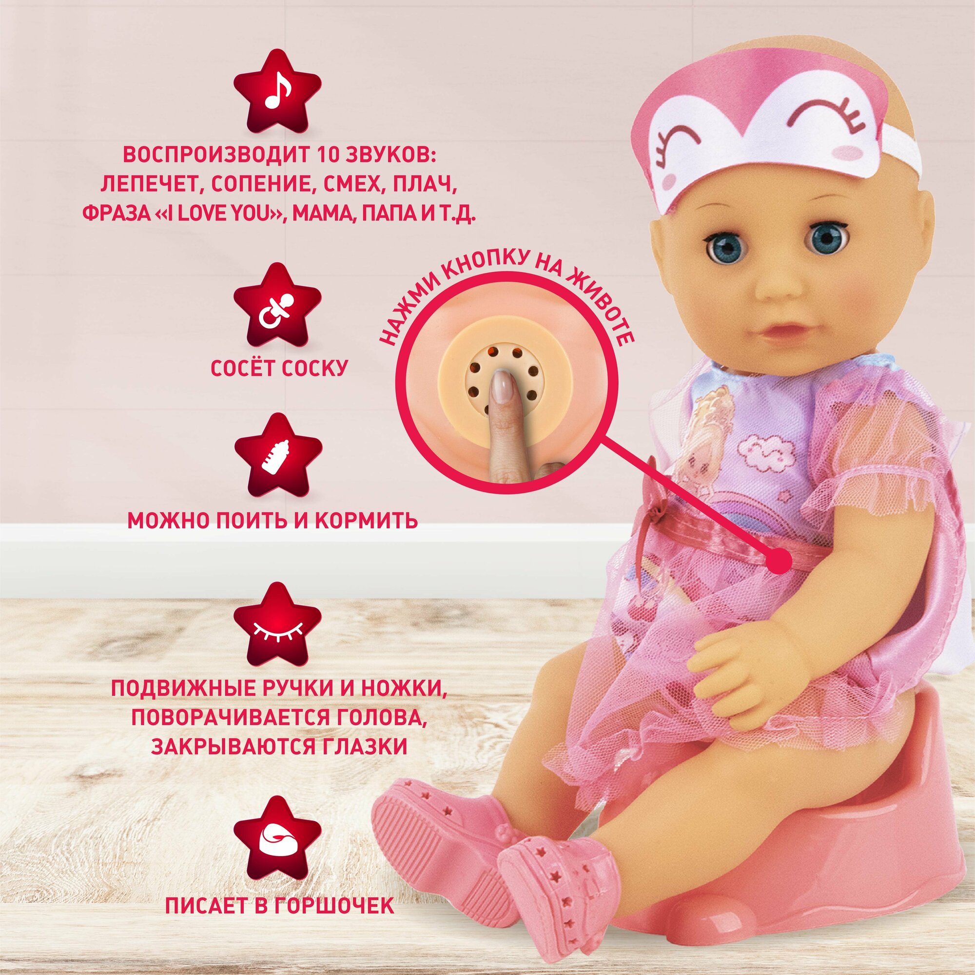 | Функции | вращается голова / говорит / закрываются глаза / плачет / пьет-писает / смеется |
