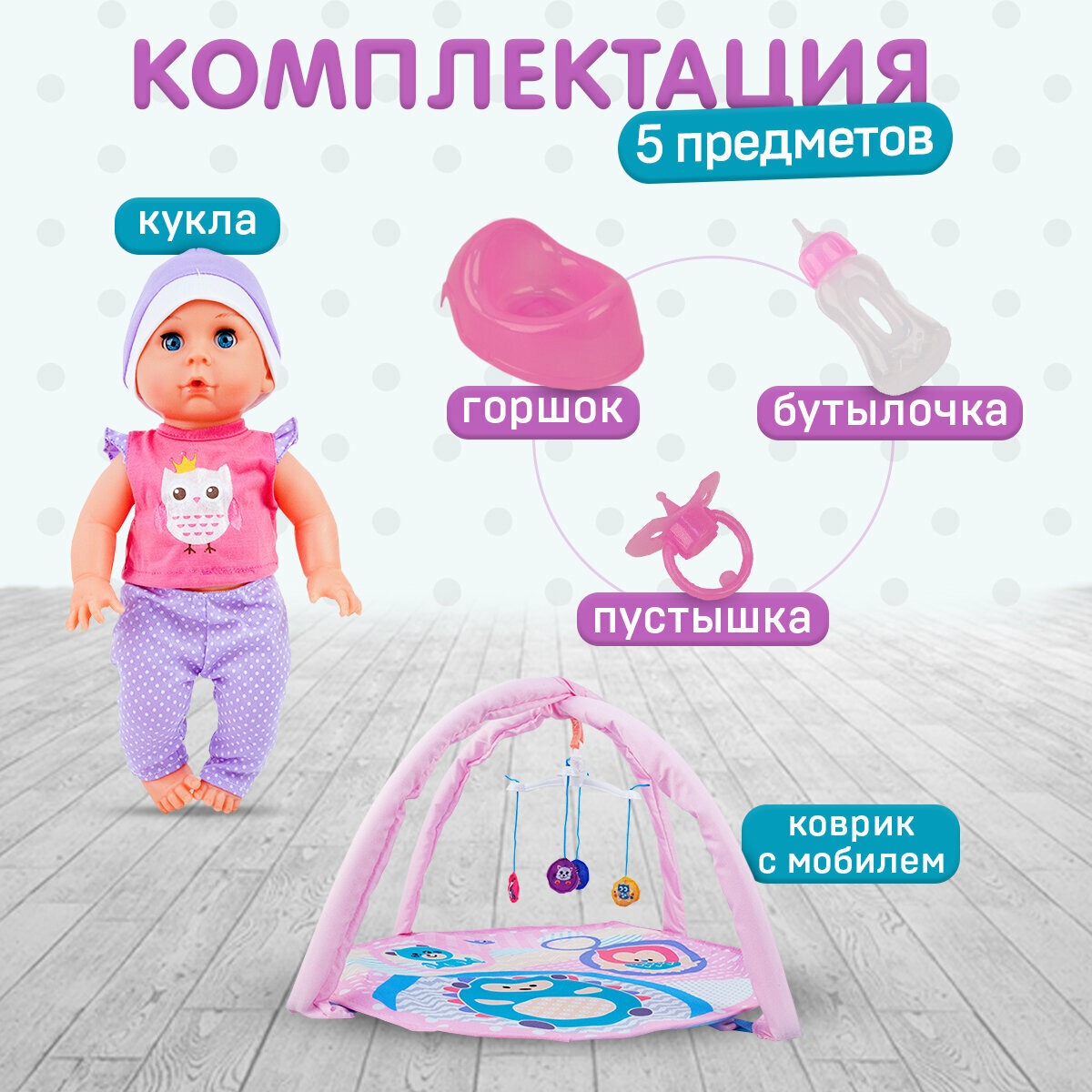 | Комплектация | кукла, кроватка-манеж, коляска-трость, детский коврик, музыкальный ночник со светом, соска, горшок, бутылочка, тарелочка, ложка и вилка для кормления, баночки «крем», «мыло», «присыпка», погремушка, пластиковый фартучек для кормления, две текстильные сумочки |