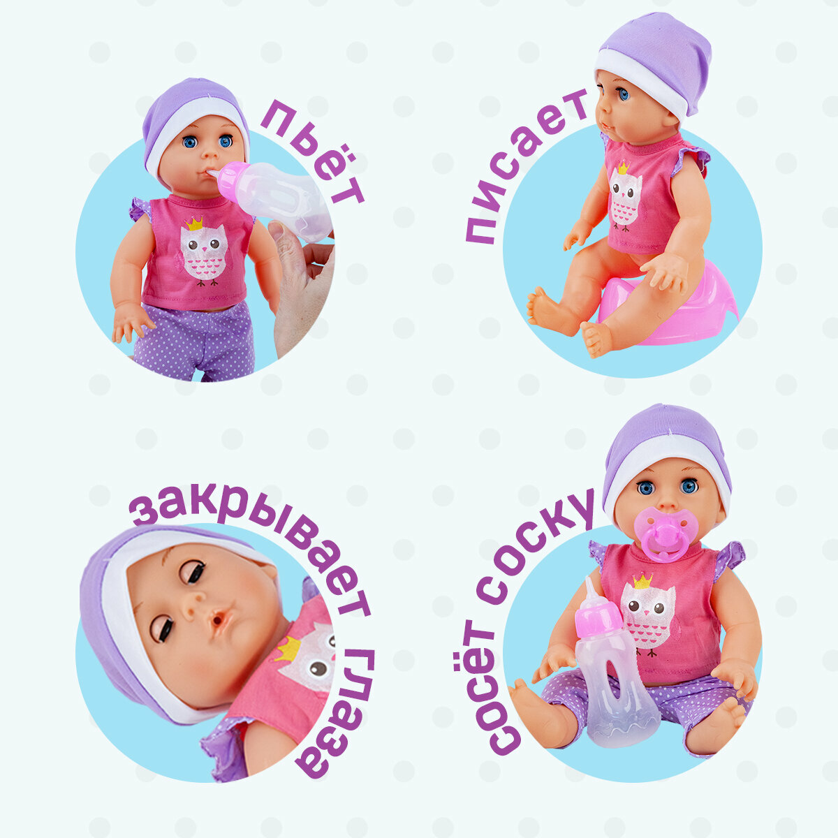 | Функции | вращается голова / говорит / закрываются глаза / плачет / пьет-писает / смеется |