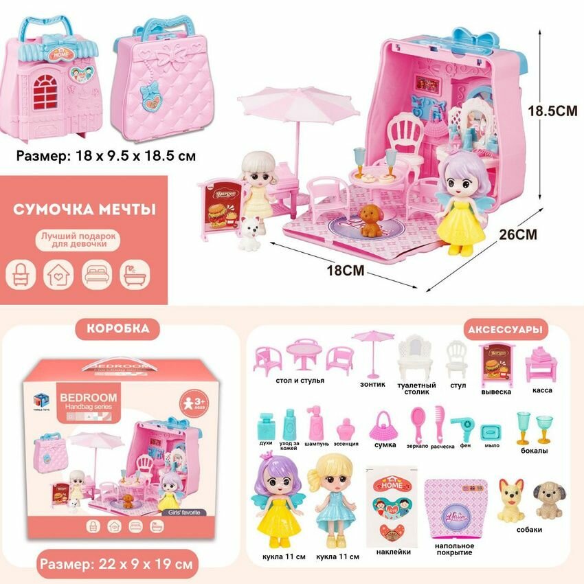 Кукольный домик - сумочка Кафе, детский игровой набор для девочки с мебелью и куклами информация: