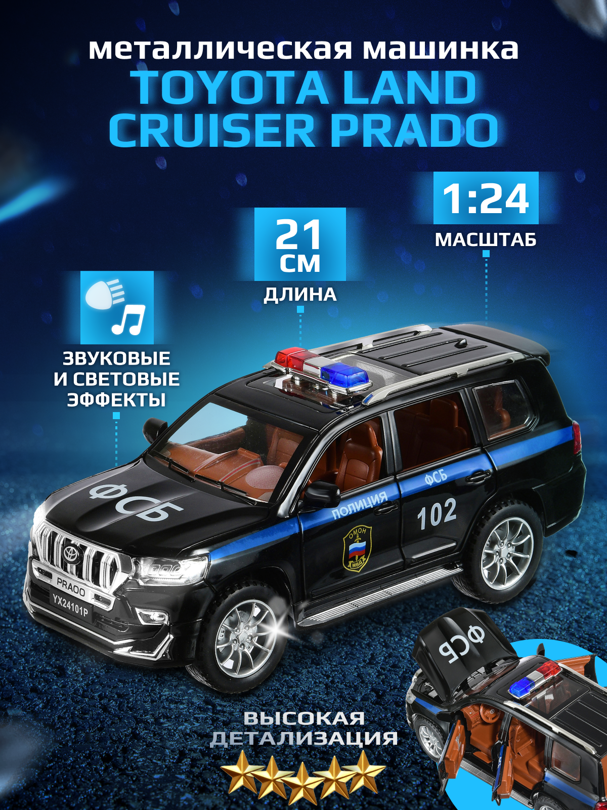 10 цен на Машинка металлическая Тойота Ленд Крузер Прадо ФСБ 1:24 21см Полиция, Toyota Land Cruiser Prado, инерционная, открываются двери, капот и багажник, свет, звук