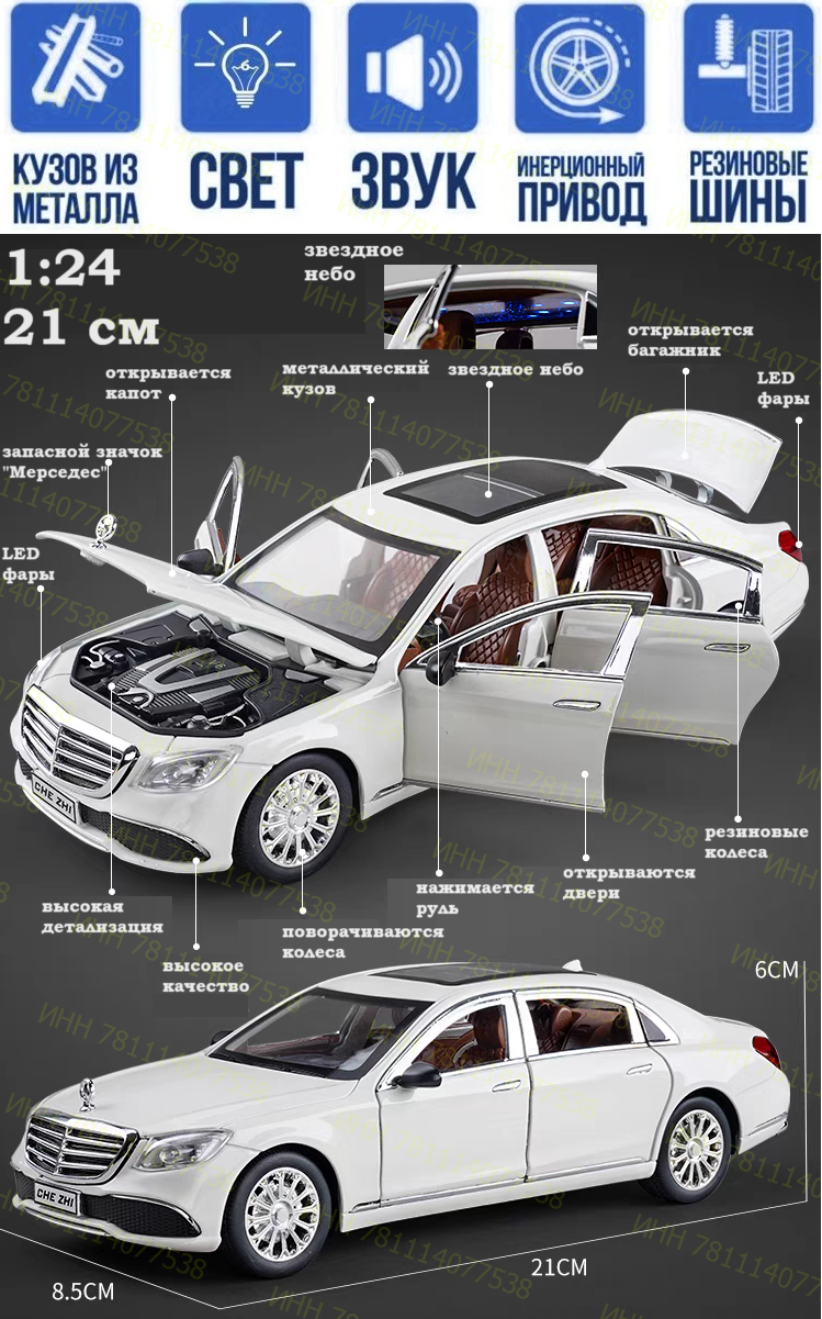 Машинка металл Мерседес Бенц E300, звездное небо, открываются двери, капот, багажник, поворачиваются колеса, со световыми и звуковыми эффектами, белая информация: