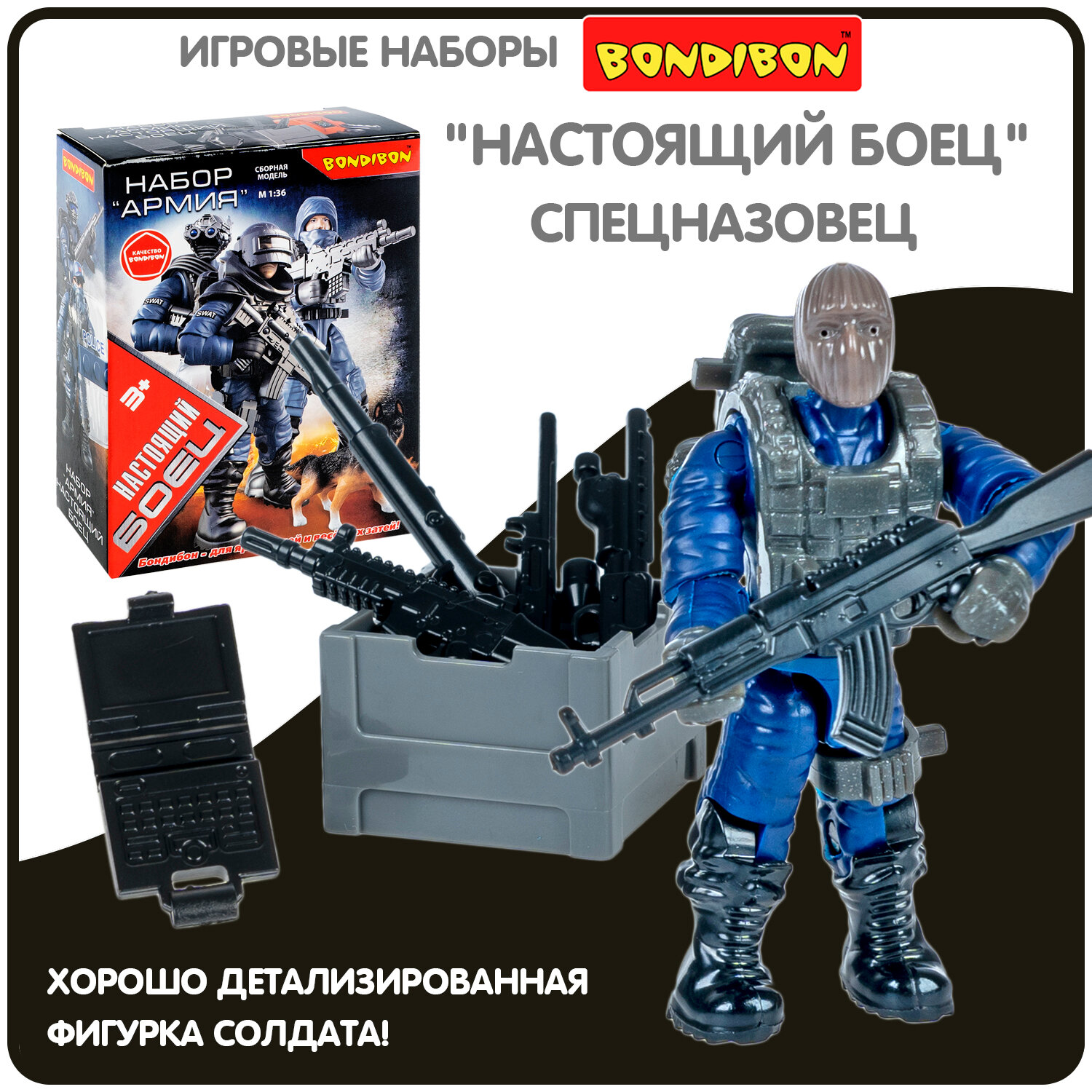 Набор солдатик с оружием, "настоящий боец" Bondibon, BOX 11,5x9x3,8 см, спецназовец, высота 6 см, информация: