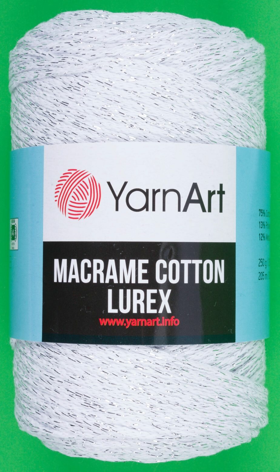 10 цен на Пряжа YarnArt Macrame cotton lurex белый-серебро (720), 75%хлопок/13%полиэстер/12%металлик, 205м, 250г, 1шт