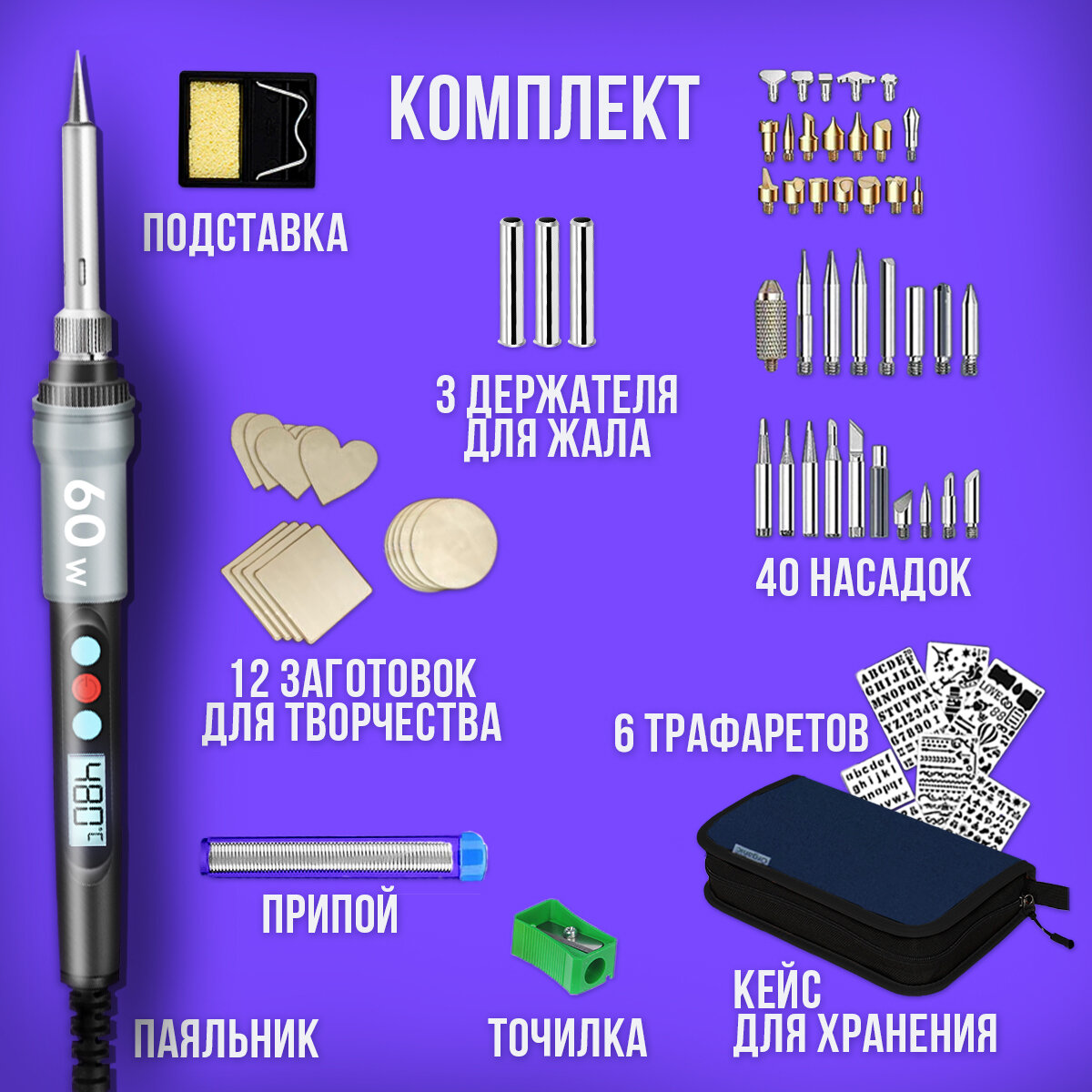 | Подробная комплектация | выжигатель - 1 шт; кейс для хранения - 1шт; подставка -1 шт; трафареты - 5шт; насадки - 40 шт; заготовок-9 шт; копировальная бумага -10 листов, цветные карандаши -18 шт; держатели жала - 3 шт |