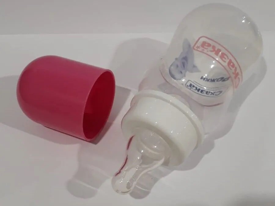Рожок для кормления "Сказка" фигурный (1008) с силиконовой соской, 125 мл, розовый А 270 ₽