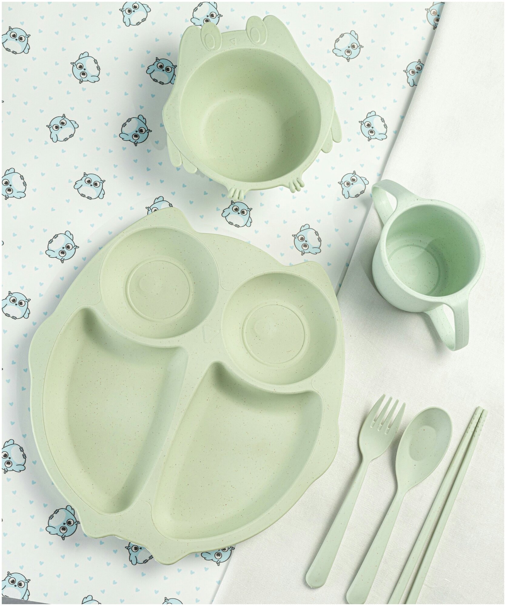 Отзывы на Детская посуда Набор Совёнок детская тарелка, ложка, вилка, кружка, зеленый