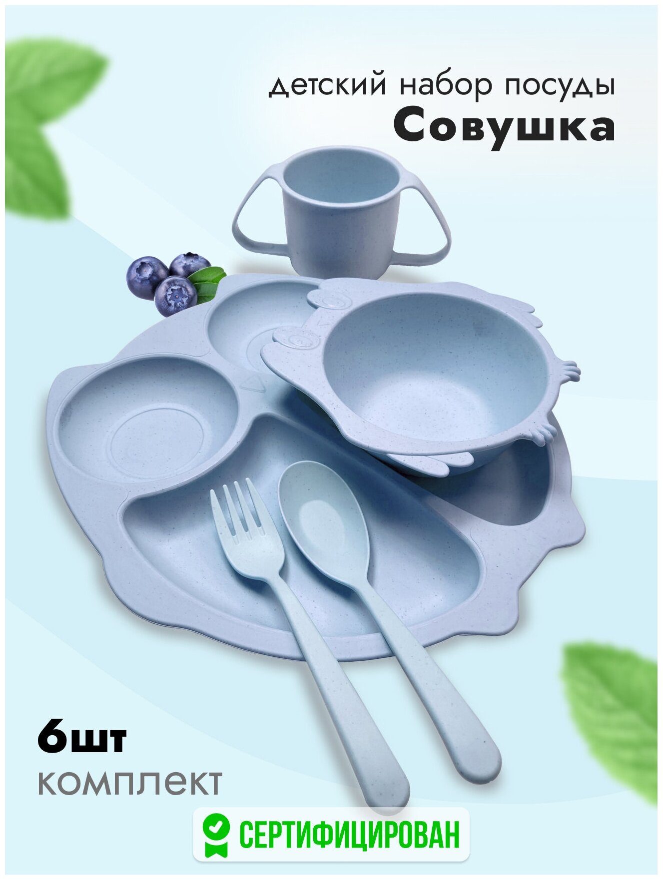 Отзывы на Детская посуда Набор Совёнок детская тарелка, ложка, вилка, кружка, голубой