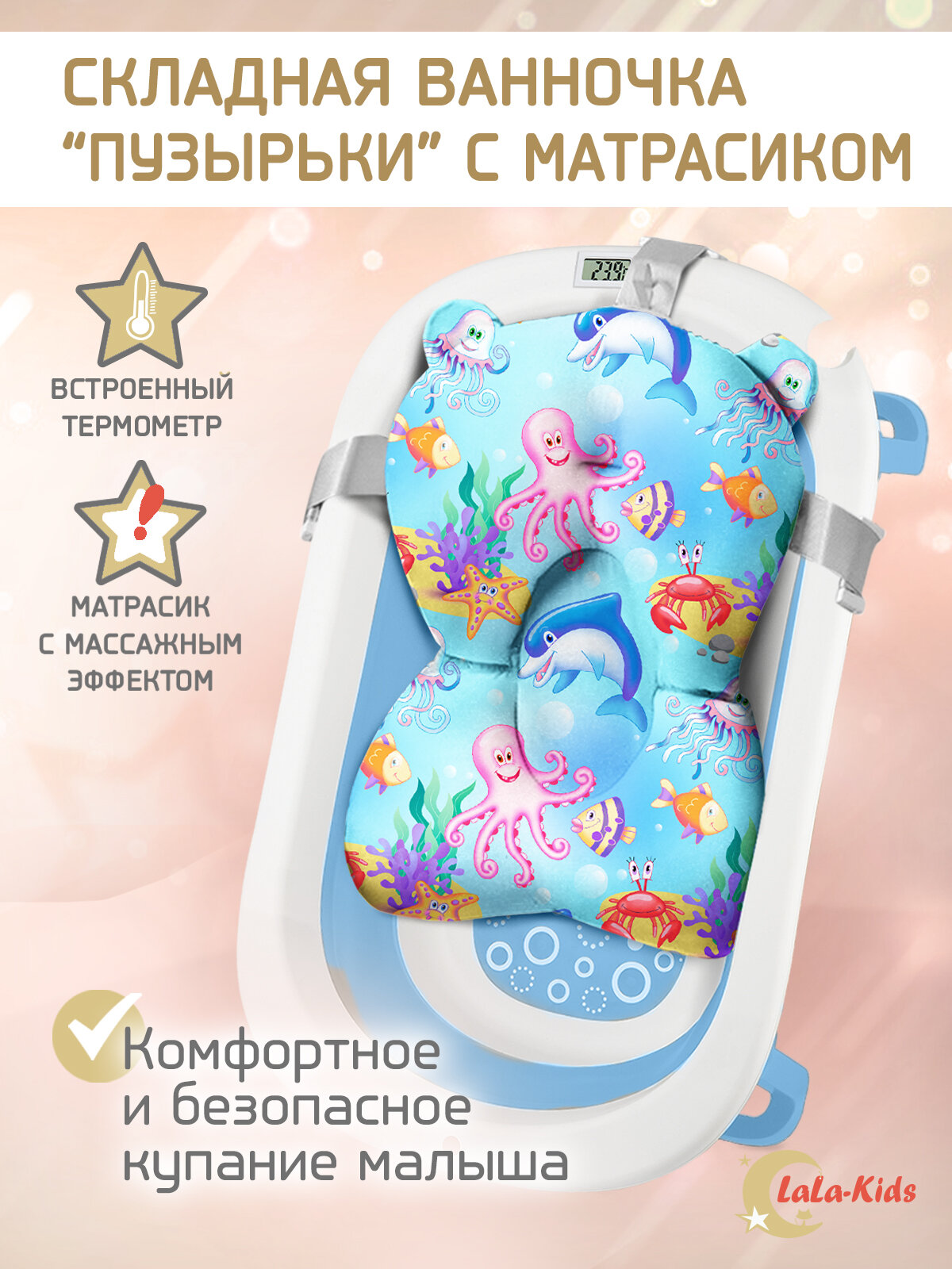 Отзывы на Ванночка для купания новорожденных складная с термометром и матрасом "Подводный мир" LaLa-Kids голубая