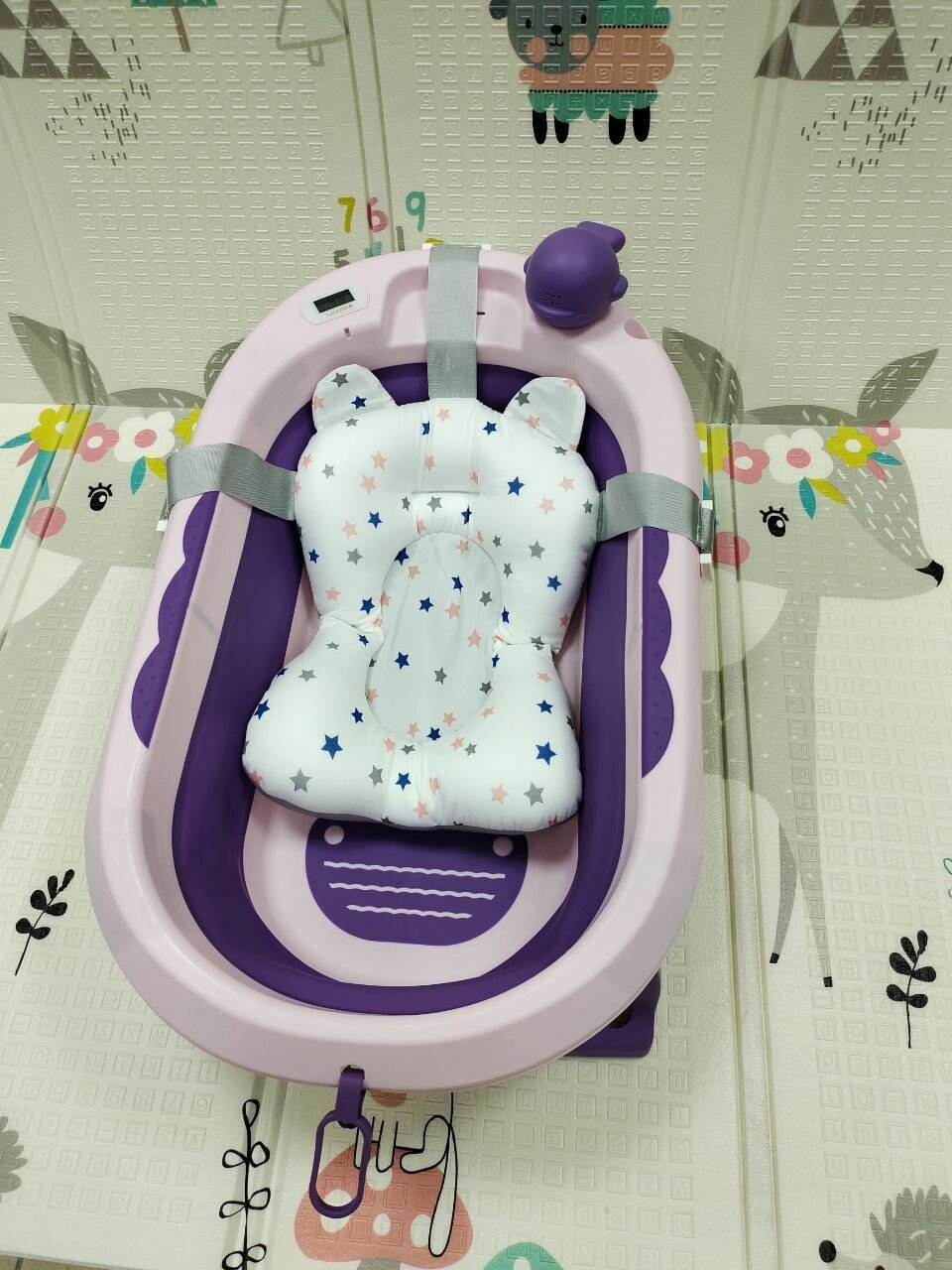 Отзывы на Детская ванночка для купания новорожденных с термометром и подушкой складная 81х51х22 фиолетовая
