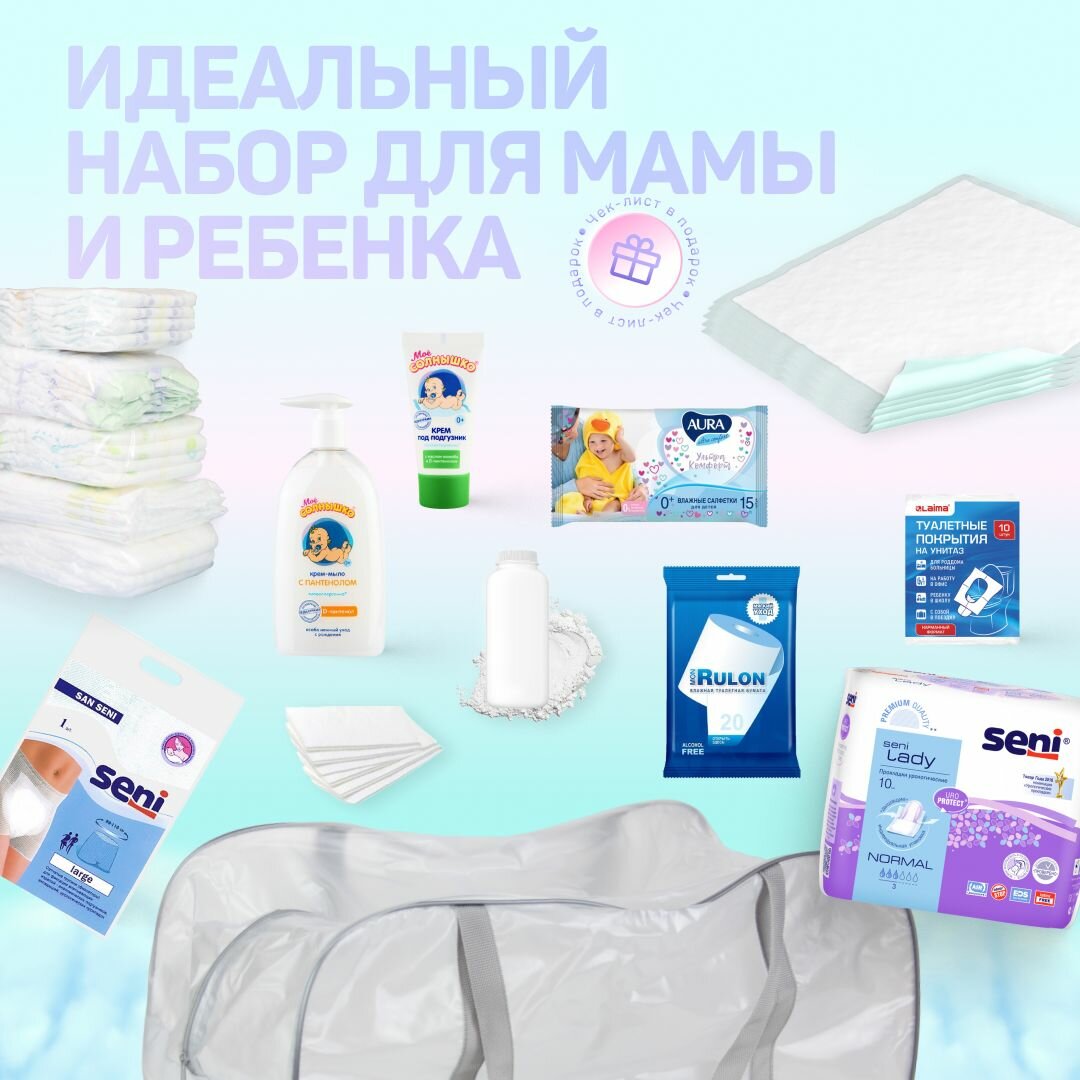 Сумка в роддом готовая для мамы и малыша с наполнением, 13 предметов + 1 матовая сумка, комплектация "Мини" информация: