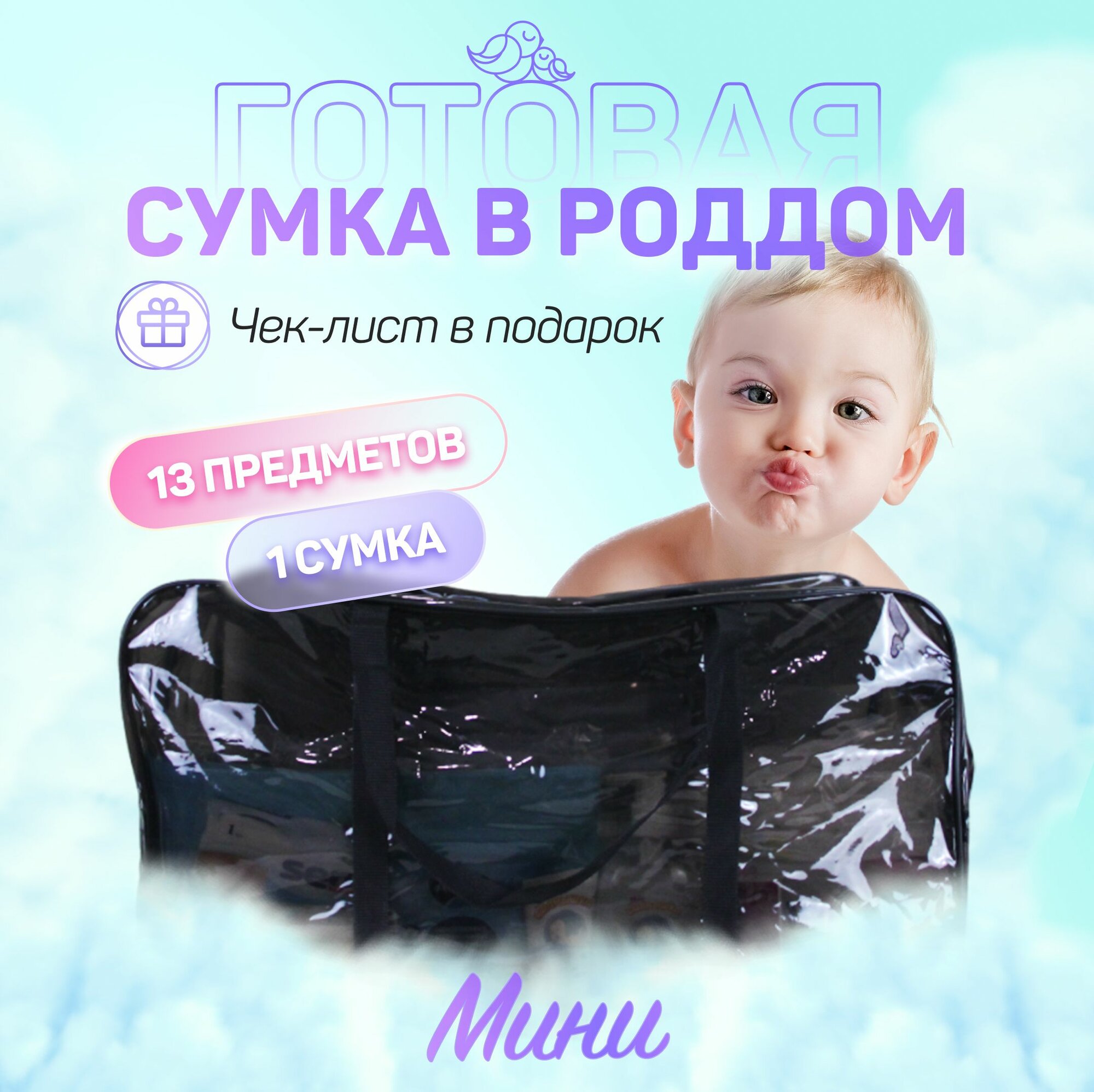 Сумка в роддом готовая для мамы и малыша с наполнением, 13 предметов + 1 фиолетовая сумка , комплектация "Мини" 3 039 ₽