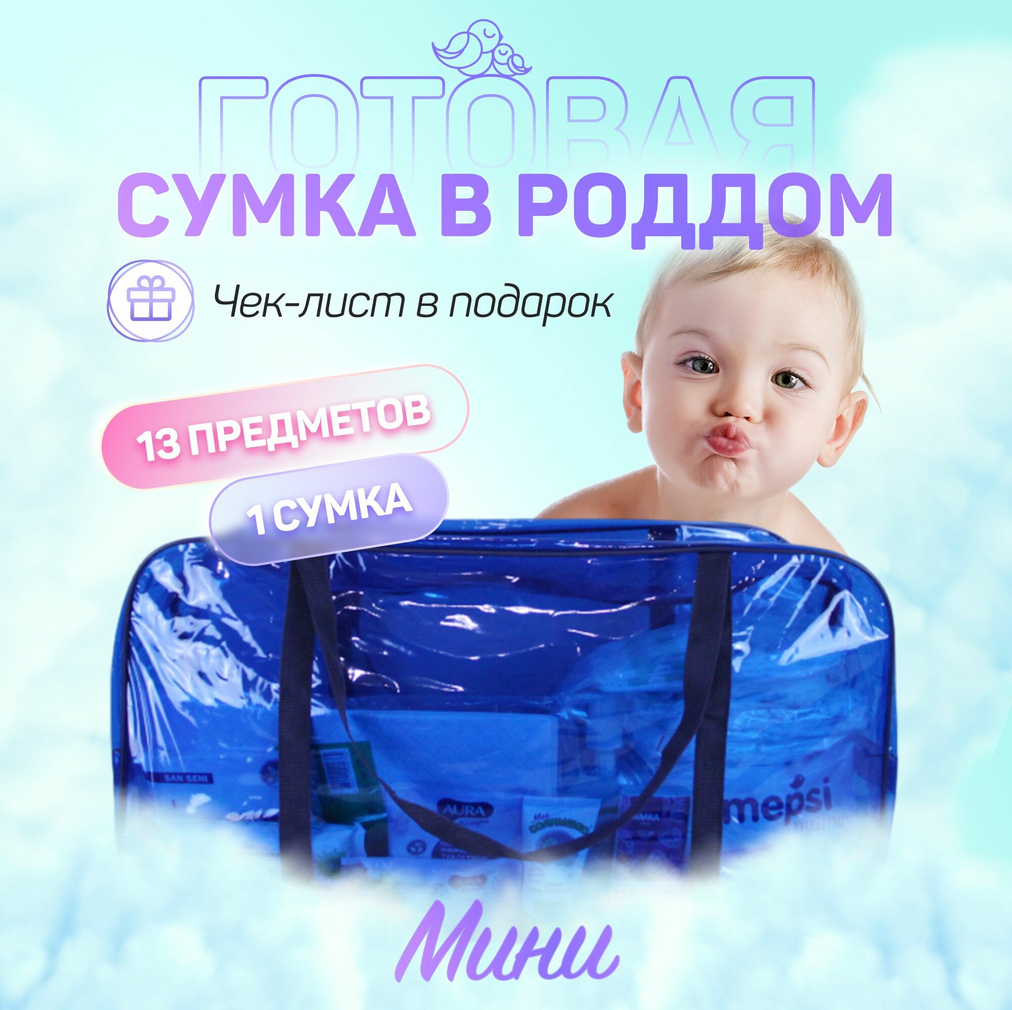 10 цен на Сумка в роддом готовая для мамы и малыша с наполнением, 13 предметов + 1 синяя сумка, комплектация "Мини"