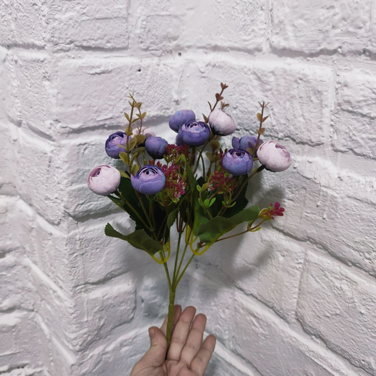 Куст искусственных цветов 31см. 5 ветвей, 13 цветков. Камелия, пион, ранункулюс, пионовидная роза. темные и светлые фиолет информация: