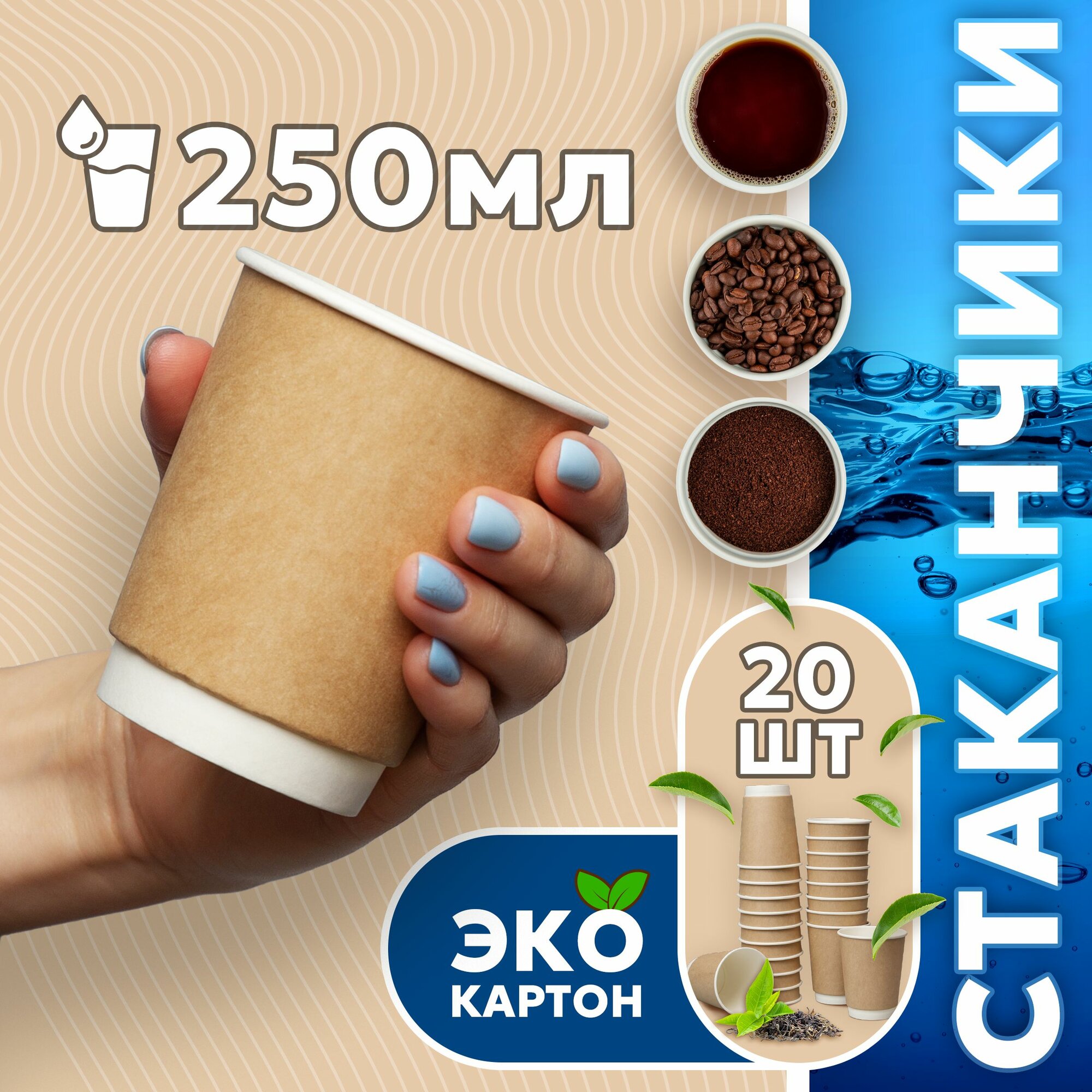 10 цен на Набор одноразовых стаканов гриникс, объем 250 мл 20 шт. крафт, бумажные, двухслойные, для кофе, чая, холодных и горячих напитков