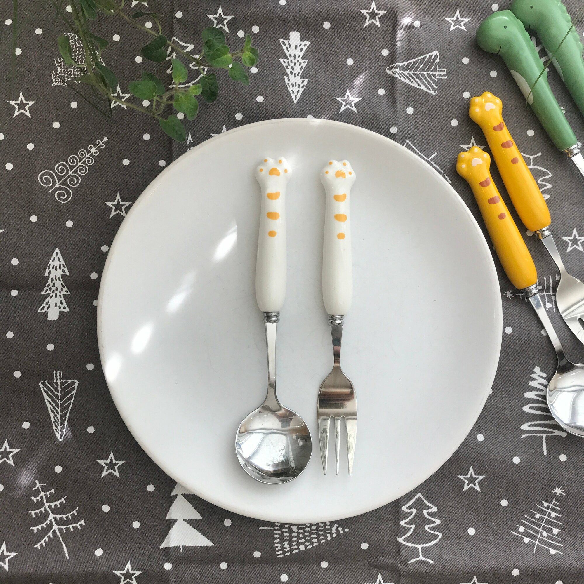 | Дополнительная информация | ложка и вилка с ручкой в форме лягушки (пластик), лапки тигра (керамика) или гуся (керамика); нержавеющая сталь 304 |