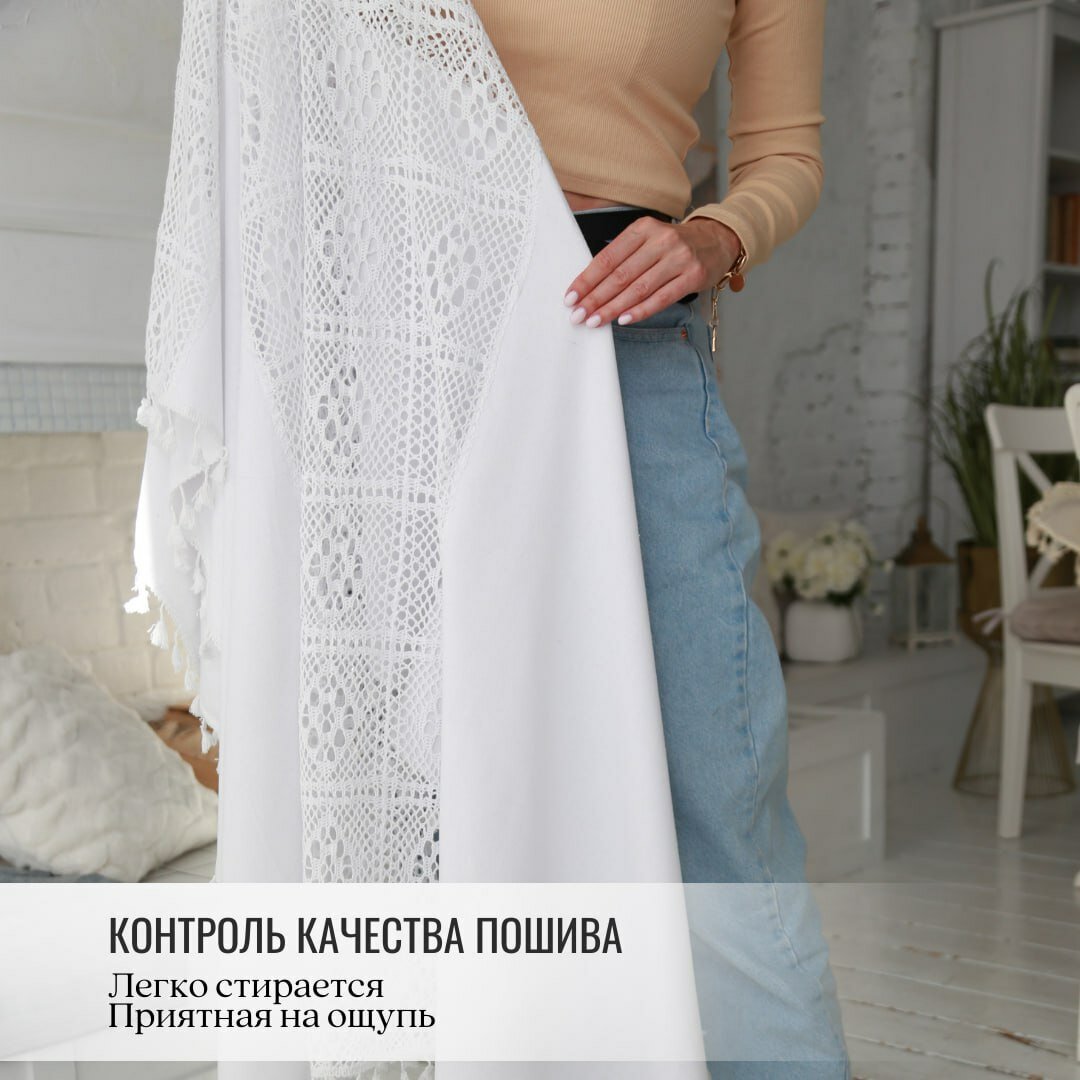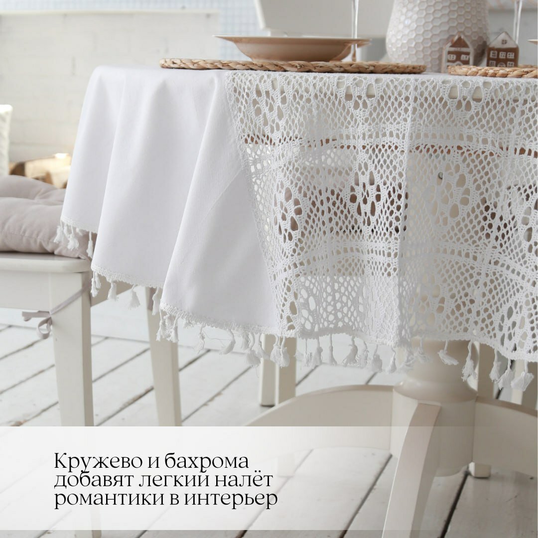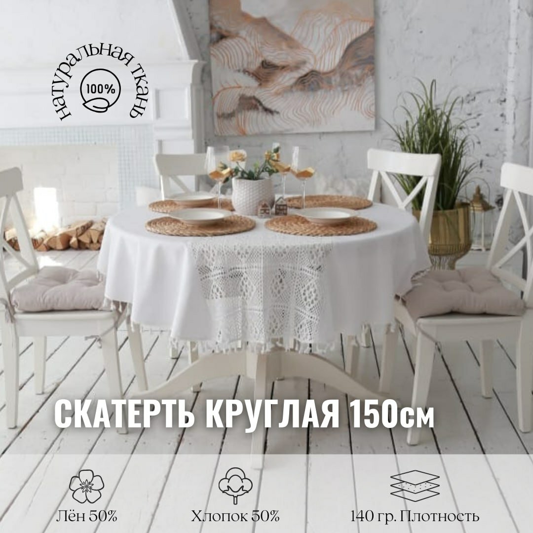 Белая скатерть круглая JollyCook тканевая кухонный на стол кружево и лен 150*150 информация: