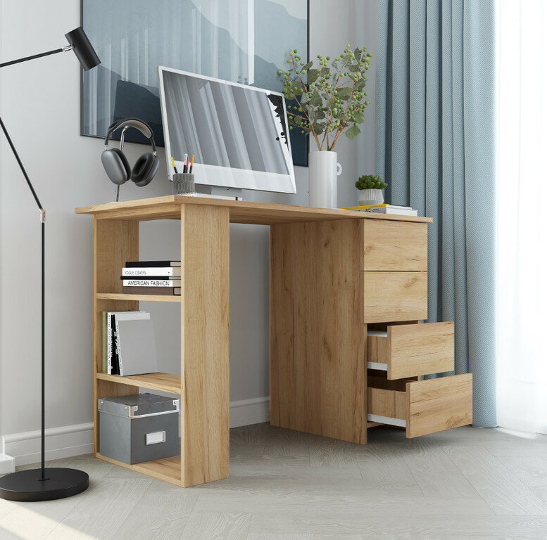 Компьютерный, письменный стол Альфа с ящиками, 106х50.4х76 см, Дуб Крафт золотой / Белый матовый