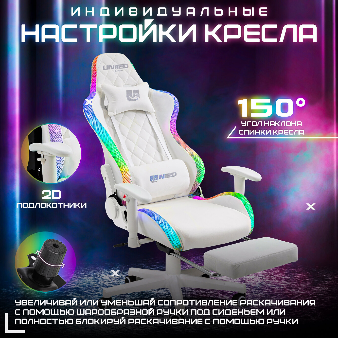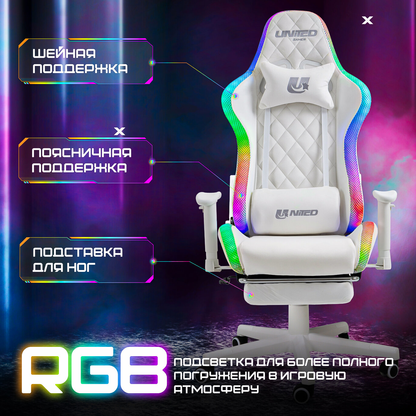 Кресло компьютерное UNITED GAMER WHITE LIGHT, RGB-подсветка, подставка для ног, белый велюр информация: