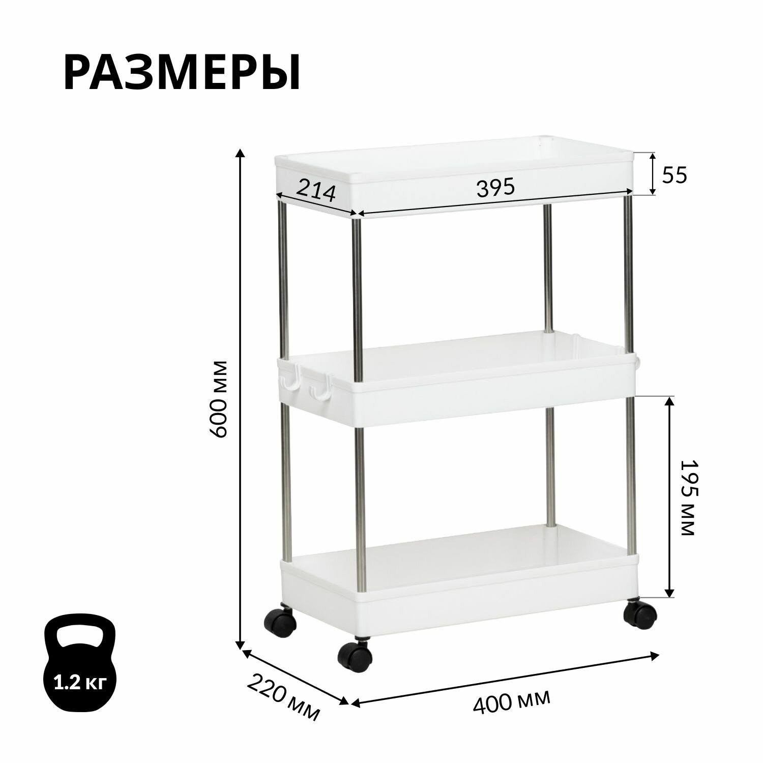 | Дополнительная информация | Размер полок внутри (ШxГxВ), мм: 120х395х55. Размер полок внутри (ШxГxВ), мм: 120х395х55. Расстояние между полками (мм): 205. В комплекте колесики. |