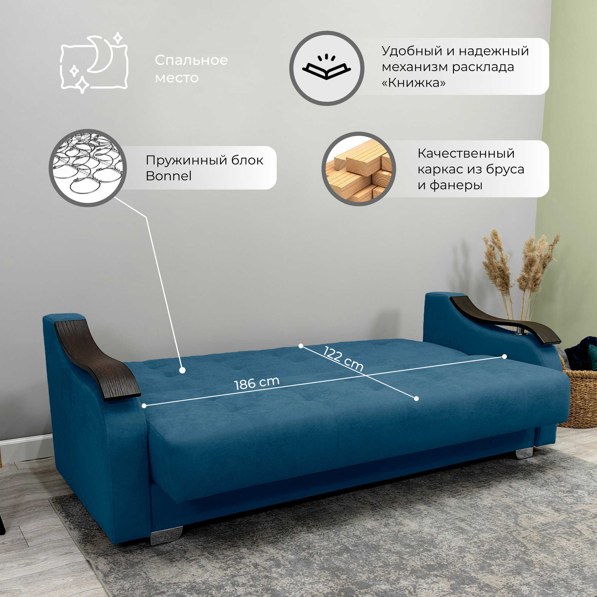 | Особенности | раскладная конструкция, с подлокотниками, ящик для белья |