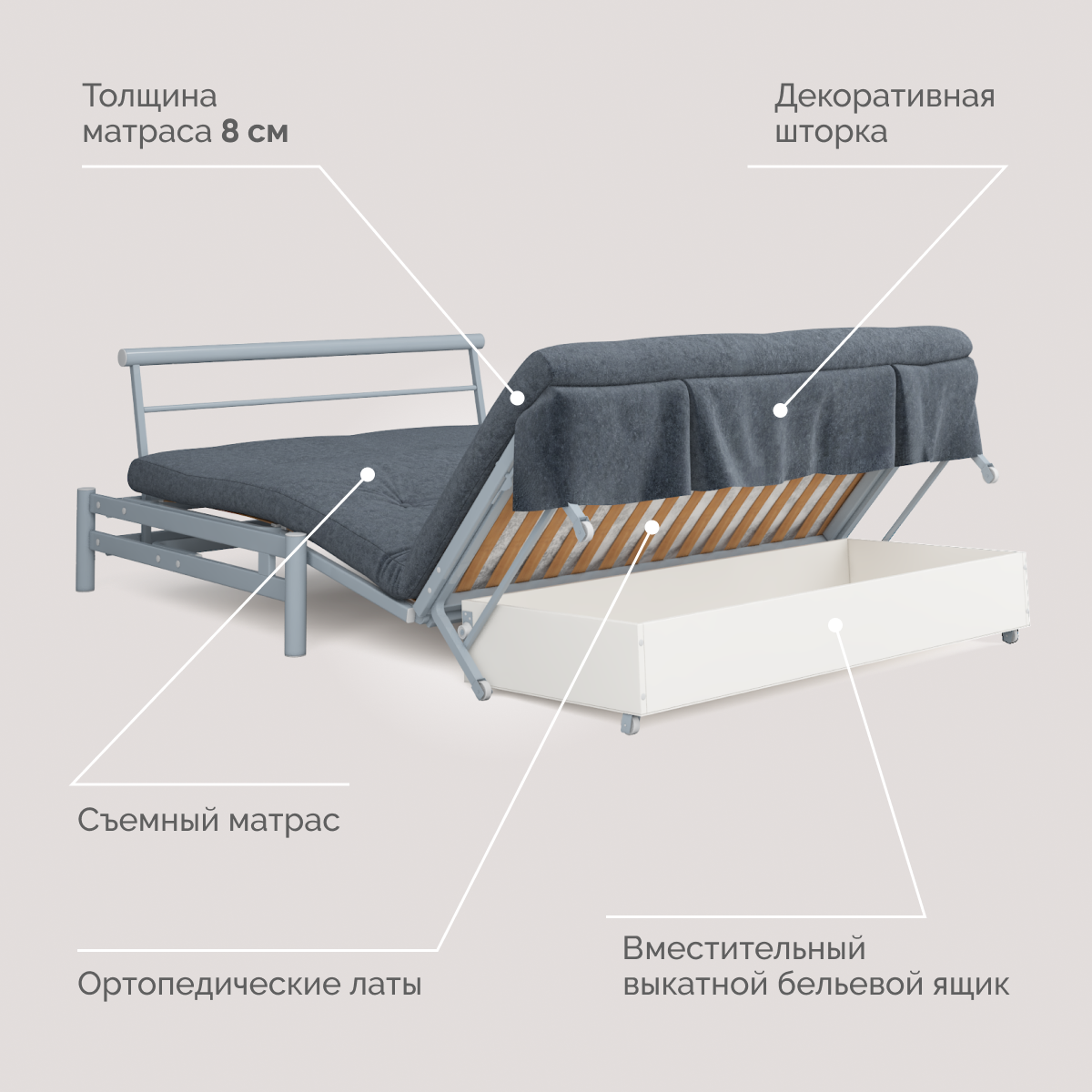 | Особенности | без подлокотников, раскладная конструкция, ящик для белья |