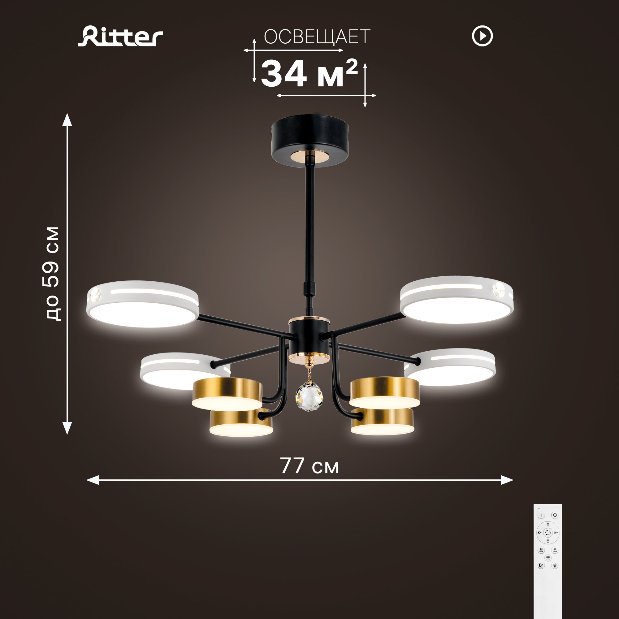 Отзывы на Люстра потолочная светодиодная Ritter SCANDIA, c ДУ, 3 режима, 112Вт, 34 кв.м., цвет белый/золото/черный 51650 1
