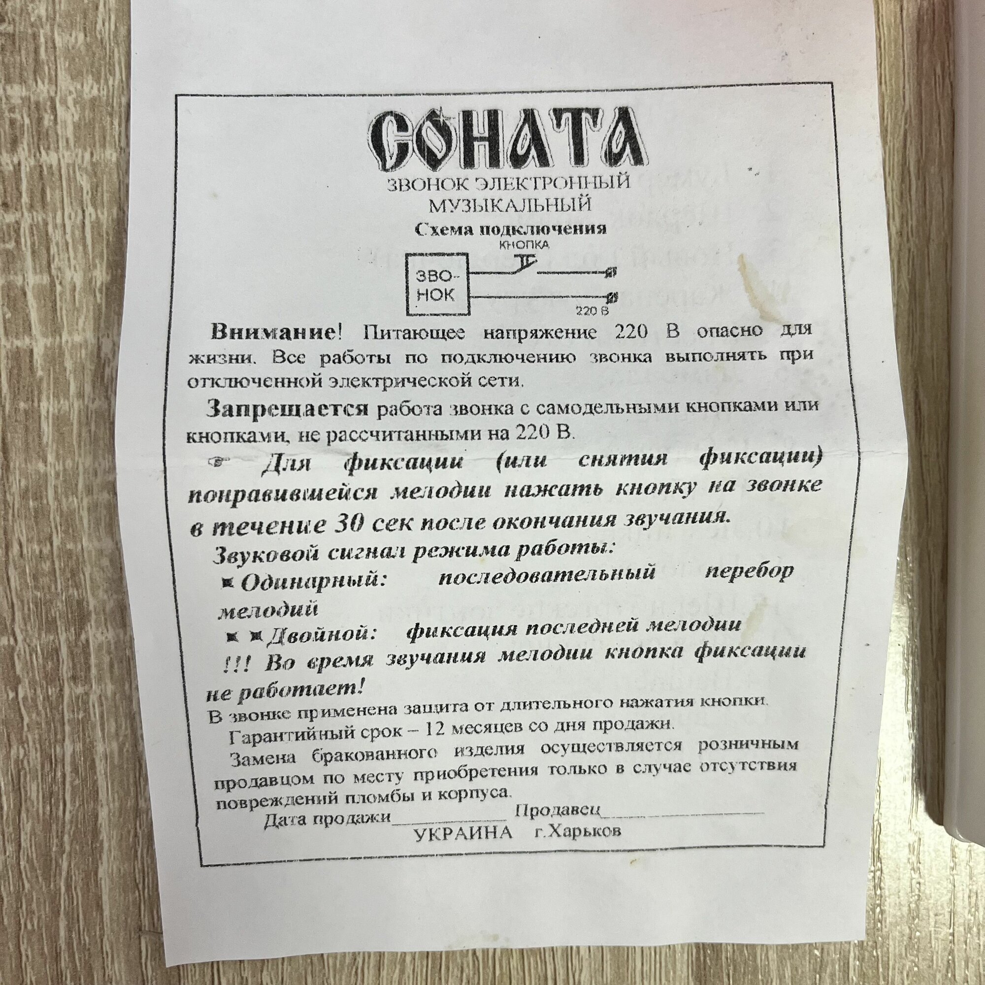 Звонок дверной проводной "Соната" от сети 220в 16 мелодий информация: