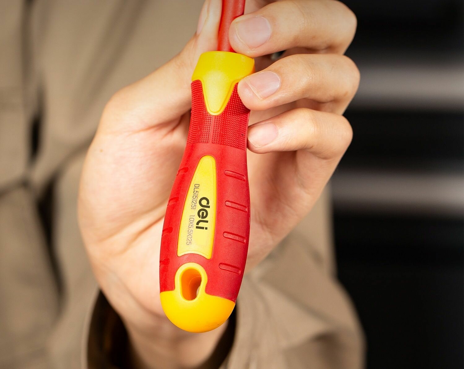 10 цен на Диэлектрическая шлицевая отвертка Deli DL5151251 5,5х125мм (сертификат VDE до 1000В, магнитный наконечник, сталь Cr-V, рукоять PP+TPR)