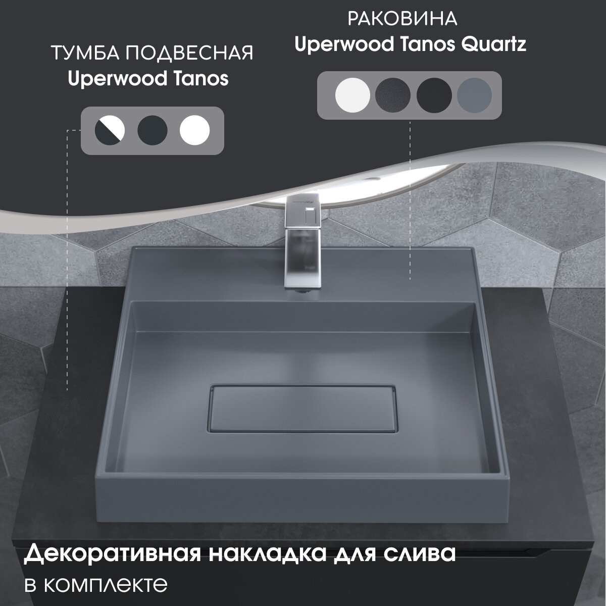 Раковина для ванной накладная кварцевая Uperwood Tanos Quartz 50 см, прямоугольная, с декоративной накладкой, бетон информация: