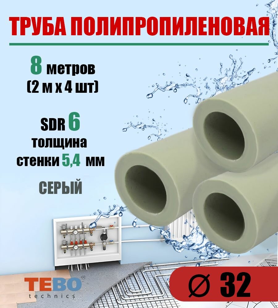 Труба полипропиленовая 32 мм (SDR 6), 8 метров (2 м х 4 шт) / Tebo (серый) информация: