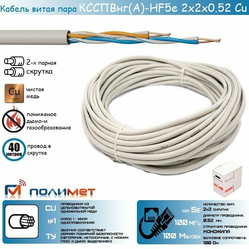 10 цен на Сертифицированный отечественный кабель сетевой (UTP) ксспвнг(А)-HF 5е 2х2х0,52 Cu медный ТУ Полимет (40 м.)
