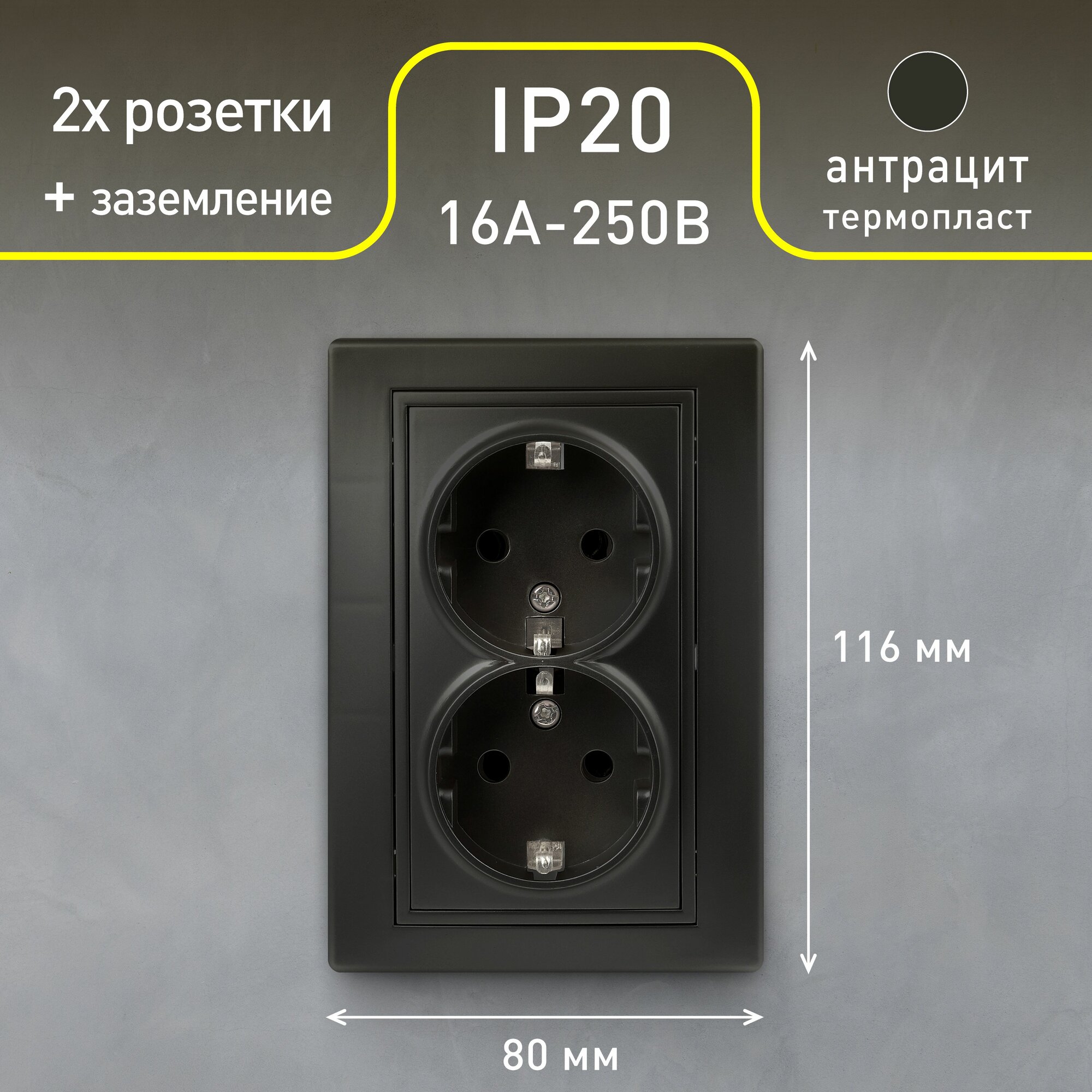 Розетка Intro Plano 1-205-05 с заземлением двойная 2X2P+E Schuko, 16А-250В, IP20, СУ, антрацит 320 ₽