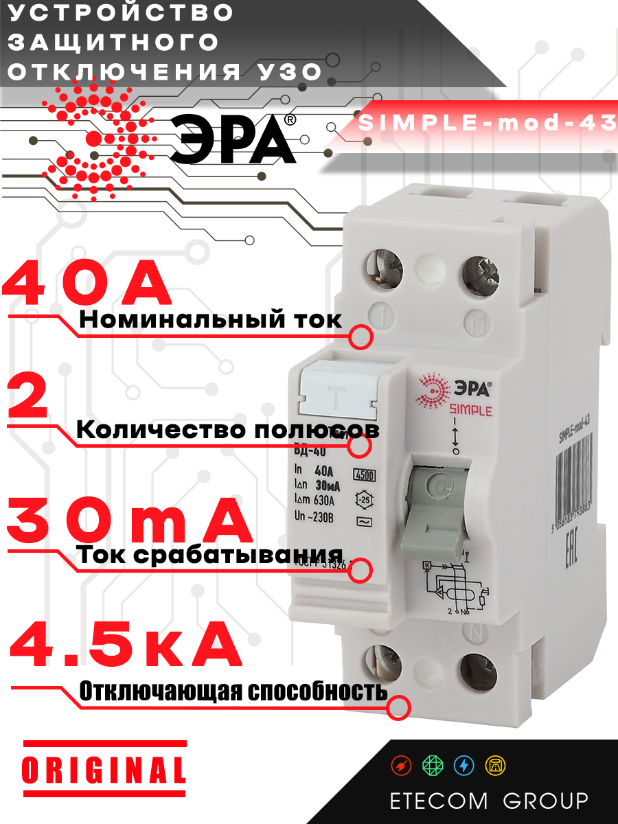 Simple-mod-52 эра simple устройство защитного отключения узо вд-40 2p 63а/300ма (электронное) (100/3, 1шт