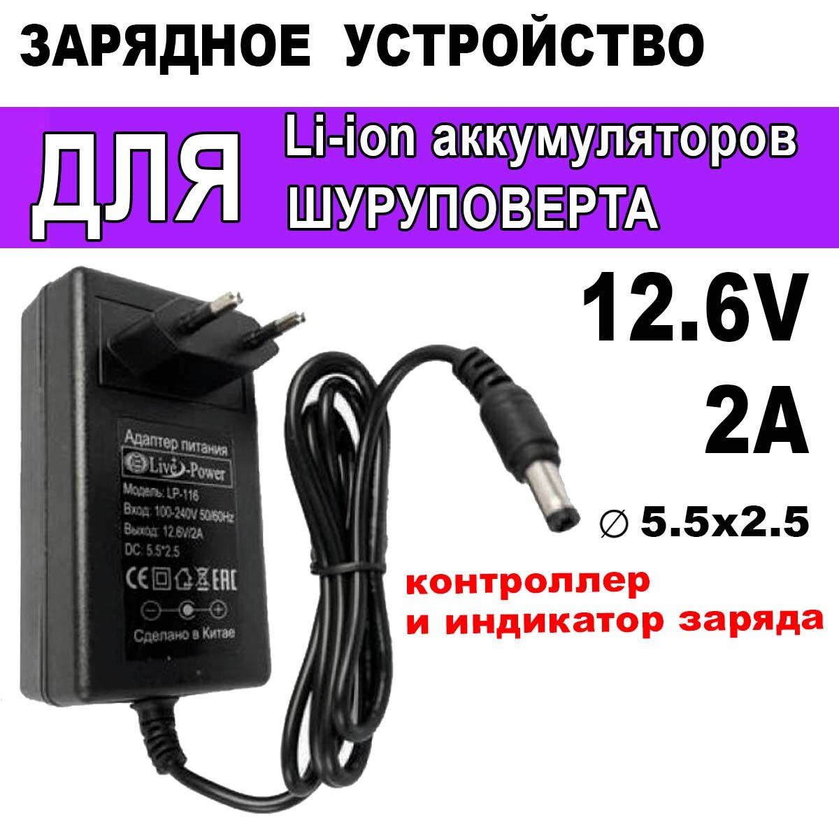 Отзывы на Зарядное устройство для шуруповерта и Li-ion сборок 12.6V 2A штекер 5.5х2.5