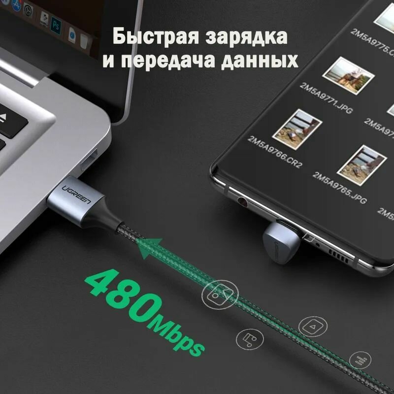 Кабель для зарядки и передачи данных USB A Male - USB C Male Ugreen, 3A, 0.5м, в оплетке, черный (60125)